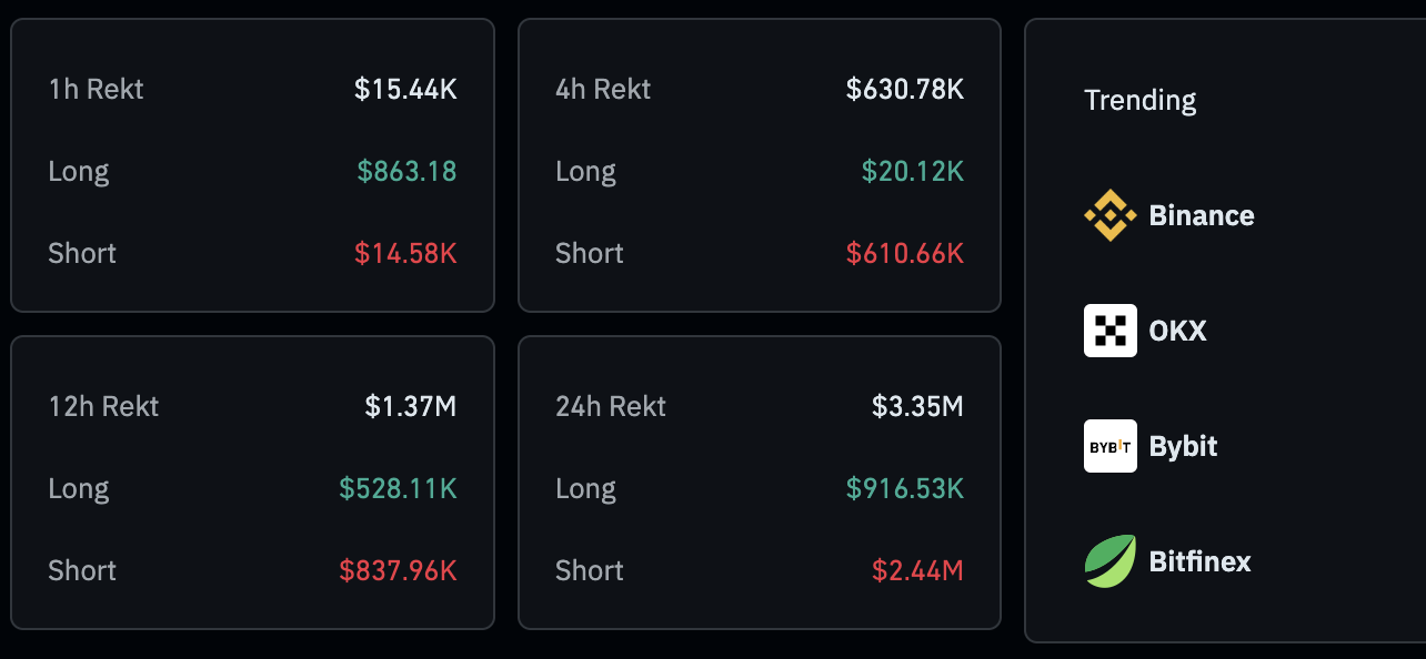 Los datos de CoinGlass muestran que las liquidaciones en las últimas 24 horas totalizaron 3.35 millones de dólares. Los titulares de posiciones cortas representaron la mayor parte de las liquidaciones con 2.4 millones de dólares en comparación con aproximadamente 916.500 dólares en posiciones largas.