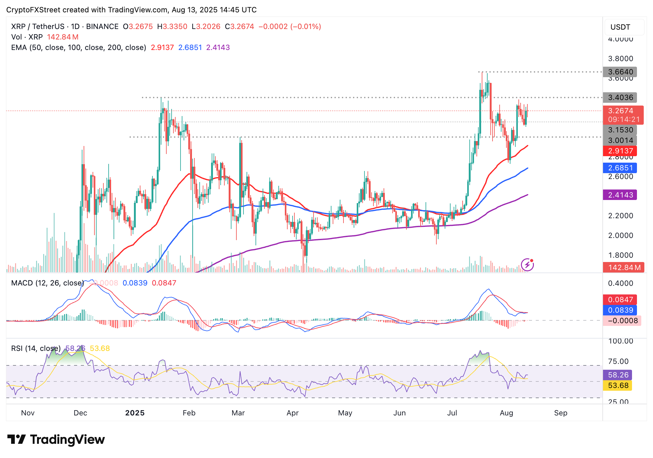 XRP se está consolidando cerca de su máximo semanal mientras los alcistas aprietan su control en el mercado de criptomonedas más amplio. Cotizando a 3.26$ en el momento de escribir, XRP muestra signos de estabilidad antes de una ruptura anticipada por encima del obstáculo a corto plazo en 3.40$, que fue probado el viernes, y el máximo histórico de 3.66$.