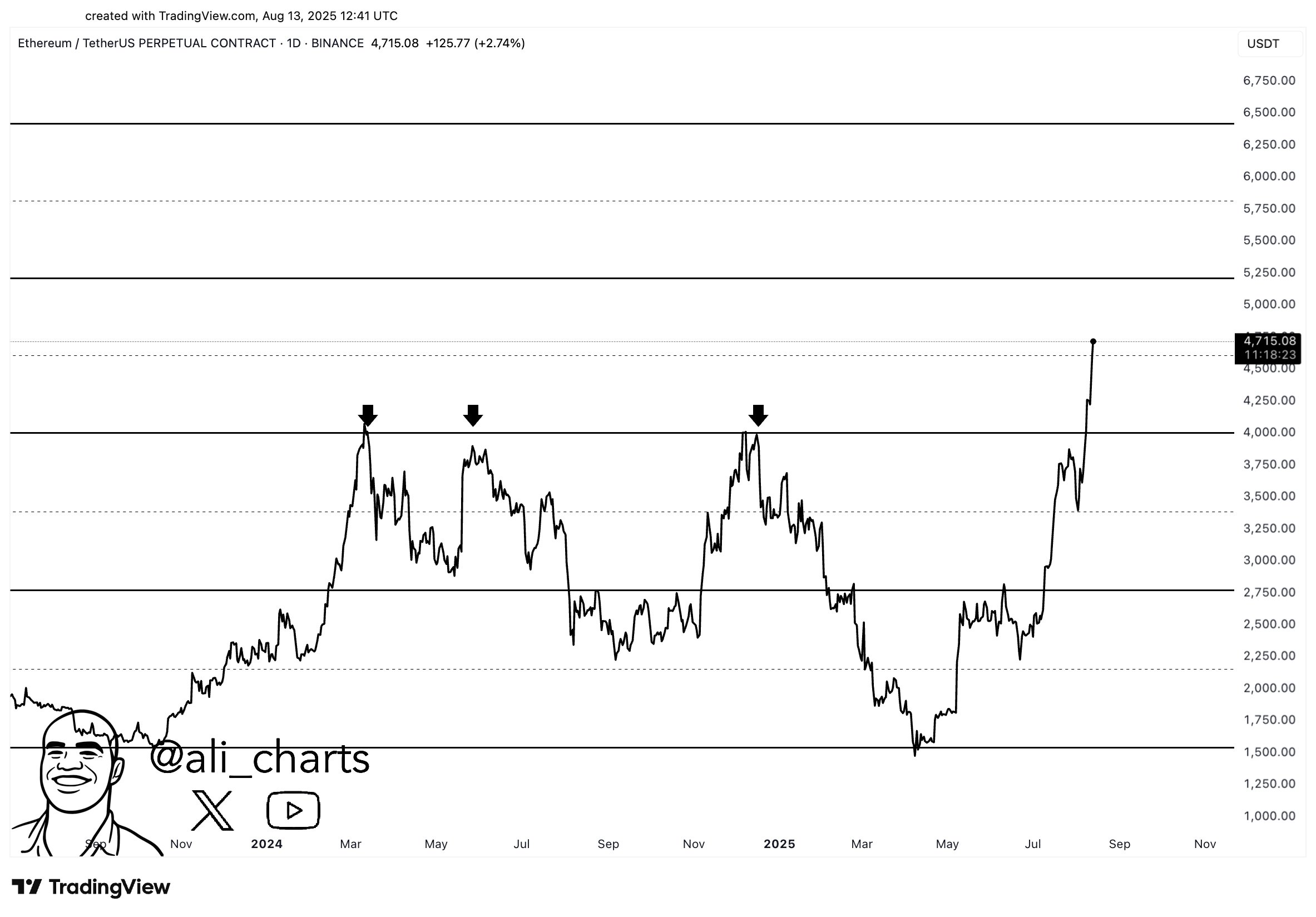 El ATH de Ethereum de 2021 es de $4,868, y recientemente alcanzó un pico diario de $4,750. Esto lo acerca al récord, a solo $138 de distancia. Un pequeño aumento trasladaría el descubrimiento de precios a un territorio desconocido, con $5,000 apareciendo como un objetivo alcanzable. Las firmas de tesorería cripto institucionales que anunciaron compras y la planificación de venta de acciones provocaron el aumento de Ether esta semana.
