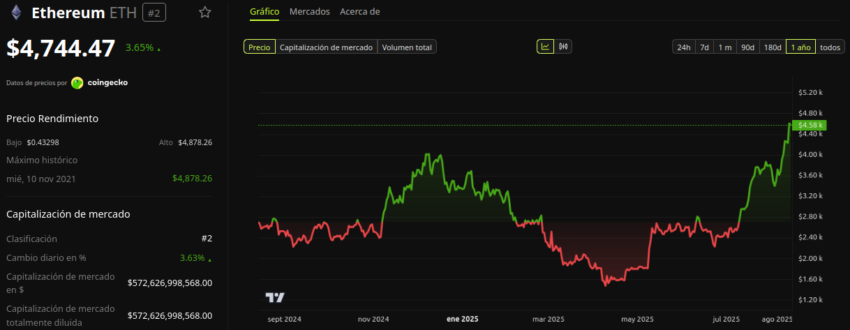 A finales de 2024, XRP parecía estar en posición de acortar la brecha, pero para agosto de 2025 la ventaja de Ethereum se había ampliado significativamente. Con un precio actual de 4,744 dólares, tras aumentar un 3.65% en 24 horas, Ethereum está a un paso de su máximo histórico de 4,891 dólares.