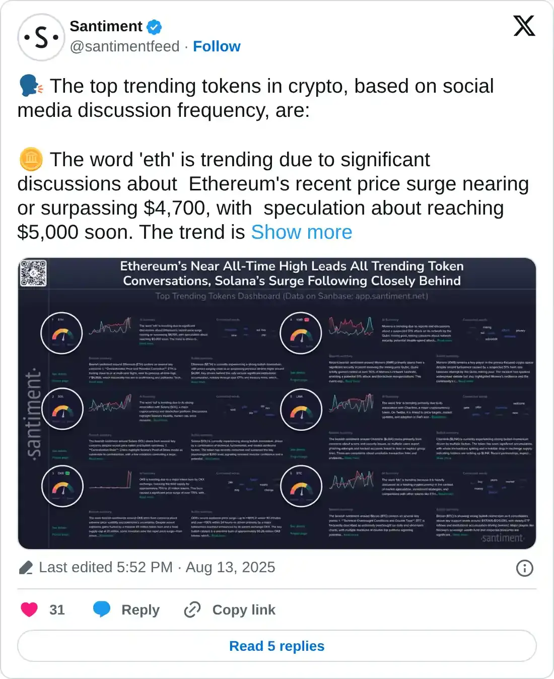 Además, el repunte de SOL ha generado un aumento en el interés en línea, con el ticker en tendencia junto a discusiones sobre la liquidez de Solana, capitalización de mercado, movimientos de precios y actividad comercial, escribió la plataforma de análisis en cadena Santiment en una publicación en X el miércoles. Los participantes del mercado también están comparando Solana con otras criptomonedas como Bitcoin y Ethereum.