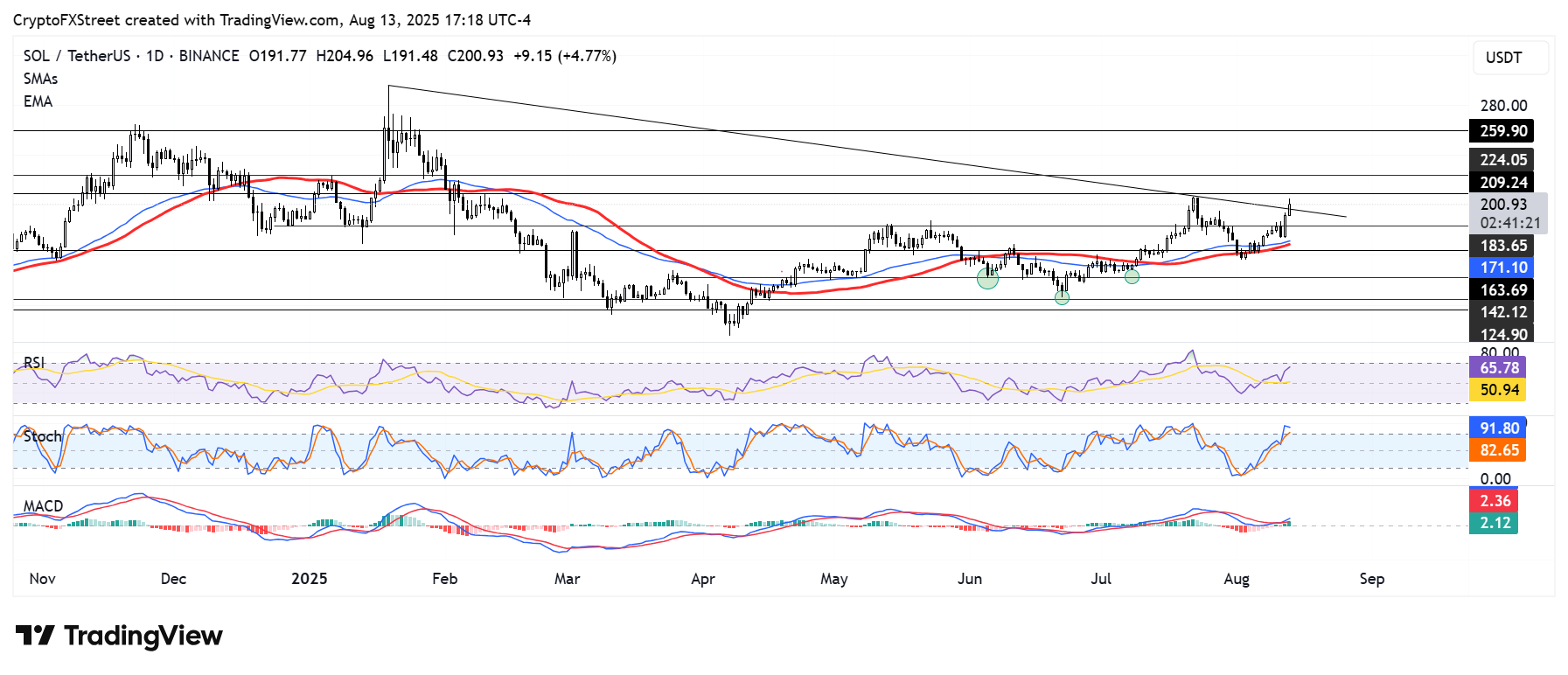 SOL subió más de un 5% en las últimas 24 horas y cruzó el nivel psicológico de 200$ cerca de una resistencia de línea de tendencia descendente. Si el altcoin mantiene la línea de tendencia descendente como soporte y supera el obstáculo en 210$, podría recuperarse para probar la resistencia en 225$.
