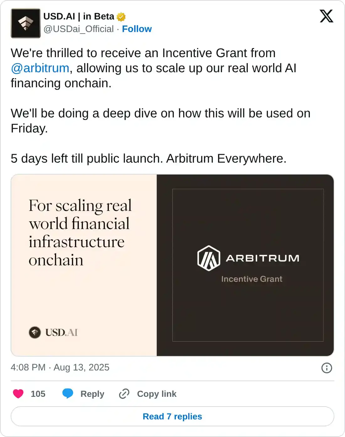 La tendencia alcista se alinea con el reciente anuncio de Arbitrum de proporcionar una subvención de inversión a USDai para escalar su financiamiento de IA en el mundo real en la cadena.