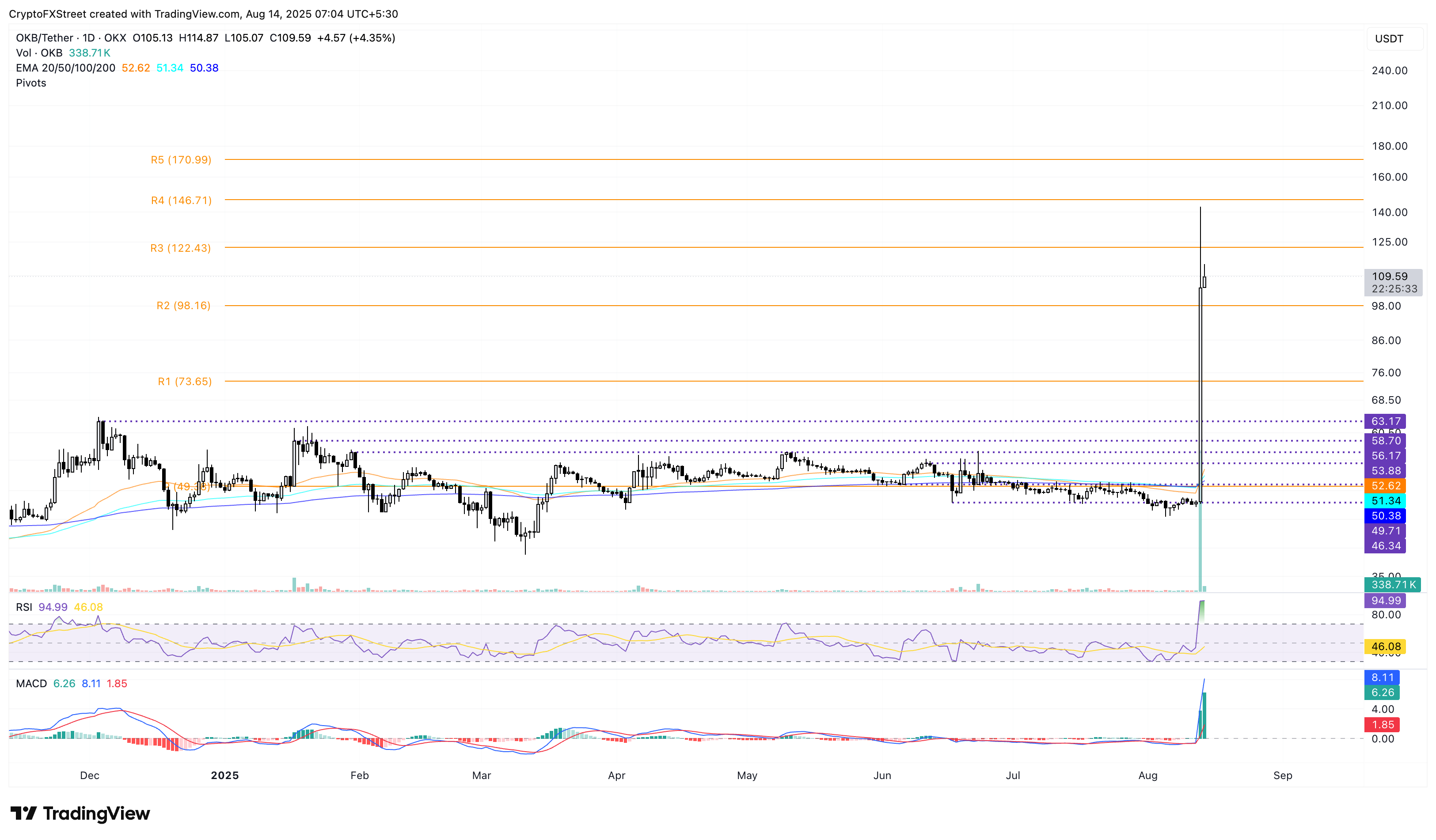 El repentino aumento de OKB refleja un desequilibrio alcista en los indicadores de impulso. En el gráfico diario, el indicador de Convergencia/Divergencia de Medias Móviles (MACD) y su línea de señal aumentan con histogramas verdes masivos, indicando un aumento del impulso alcista. El Índice de Fuerza Relativa (RSI) lee 94 en la zona de sobrecompra, indicando un riesgo de reversión.