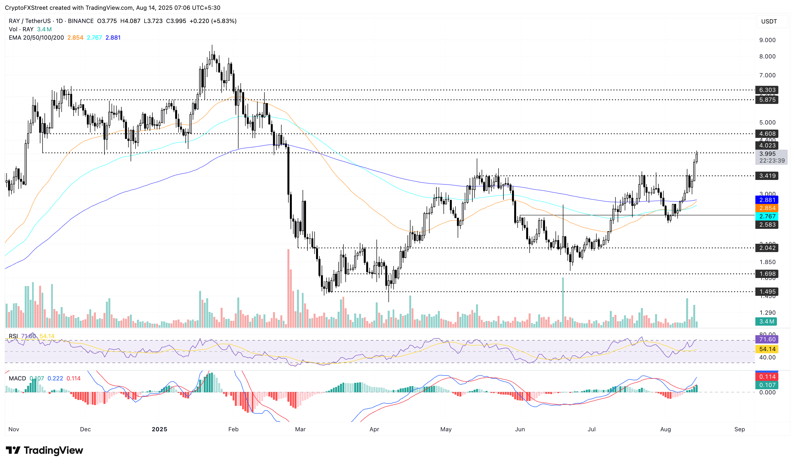 Raydium extiende la tendencia alcista en casi un 6% en este momento el jueves tras el aumento del 14% del miércoles. El token de intercambio descentralizado basado en Solana se acerca al hito de 4.00$, registrando su precio más alto desde el 24 de febrero.