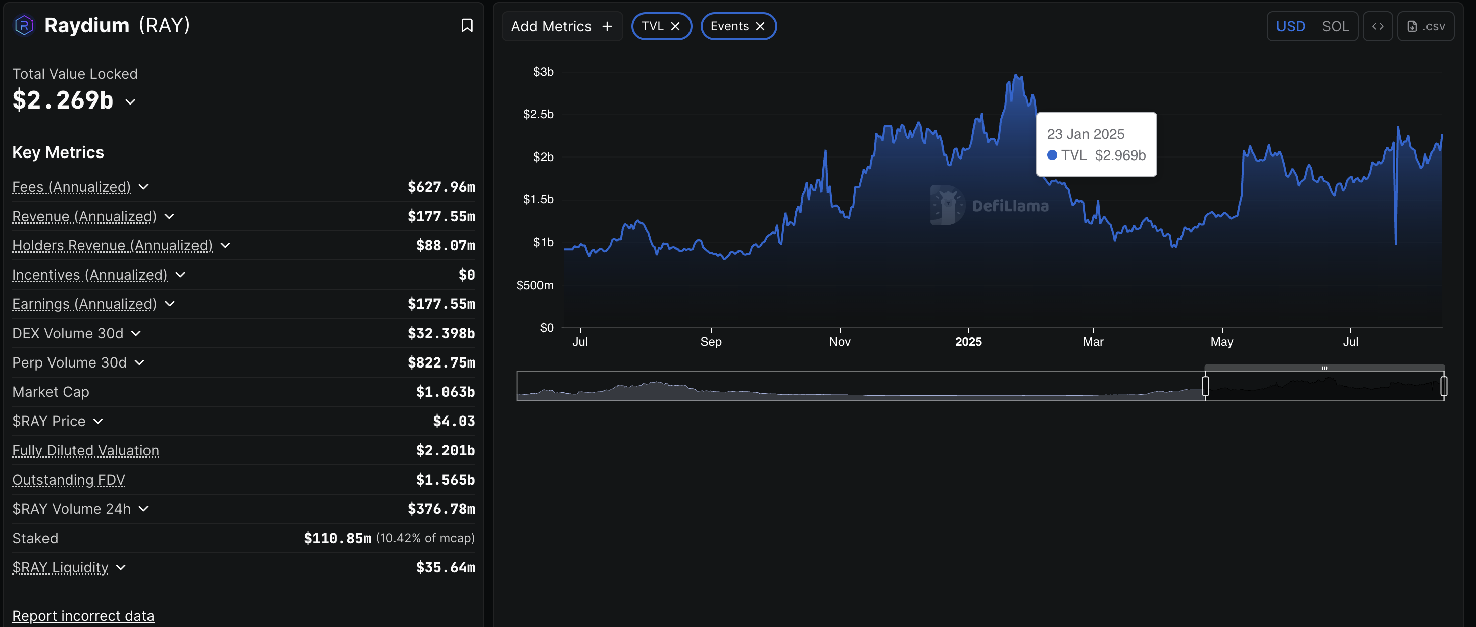 El Valor Total Bloqueado (TVL) de Raydium se sitúa en 2.269 millones de dólares, frente a 2.070 millones de dólares el día anterior, lo que sugiere una mayor actividad en la red a medida que los usuarios depositan grandes sumas de activos digitales.