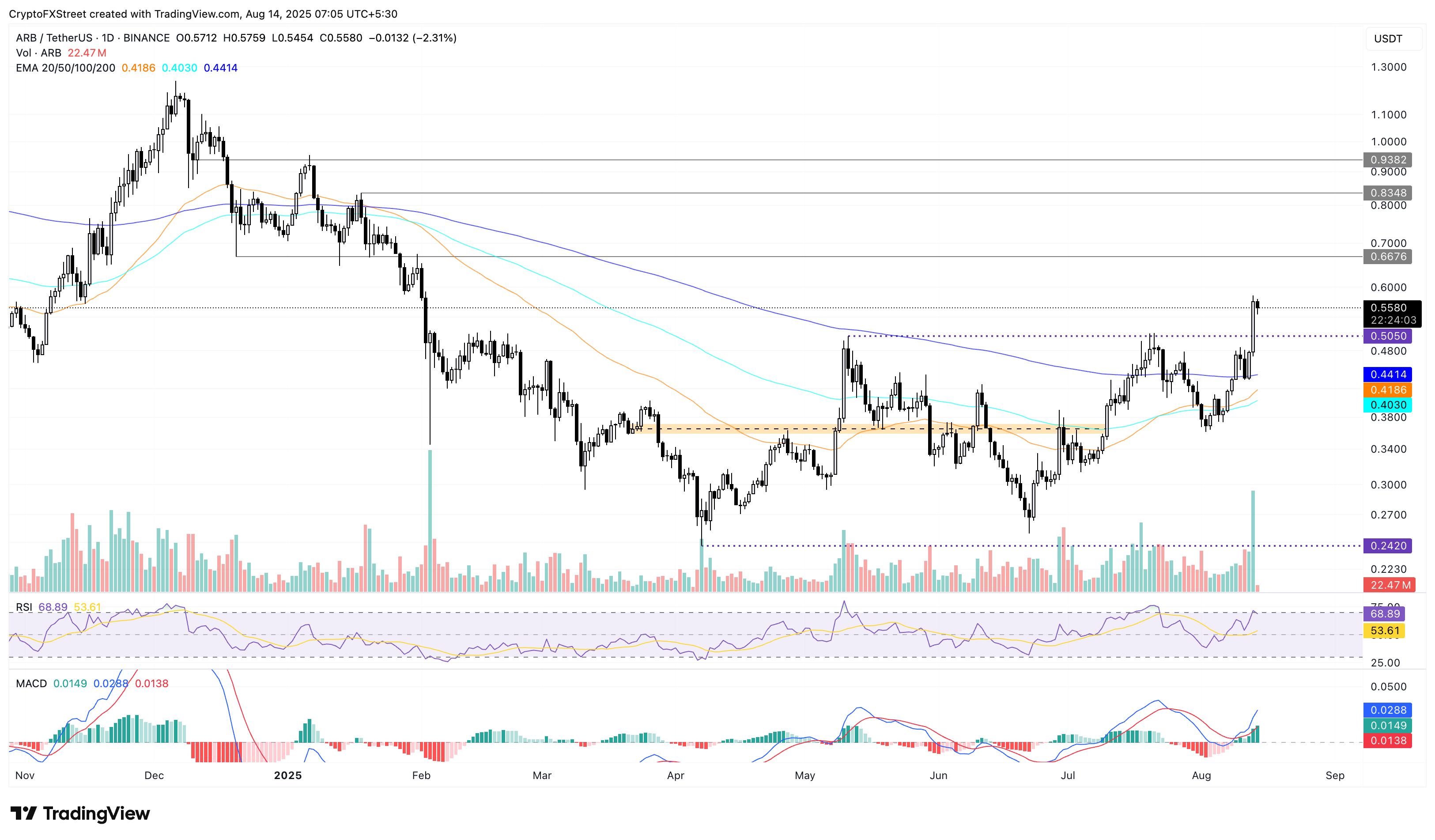 Arbitrum baja un 2% en el momento de escribir el jueves, tras el salto del 19.60% del día anterior. Aún así, la tendencia alcista ha marcado un cierre decisivo por encima de la resistencia clave de 0.5050$ y ha registrado el precio más alto desde el 2 de febrero.