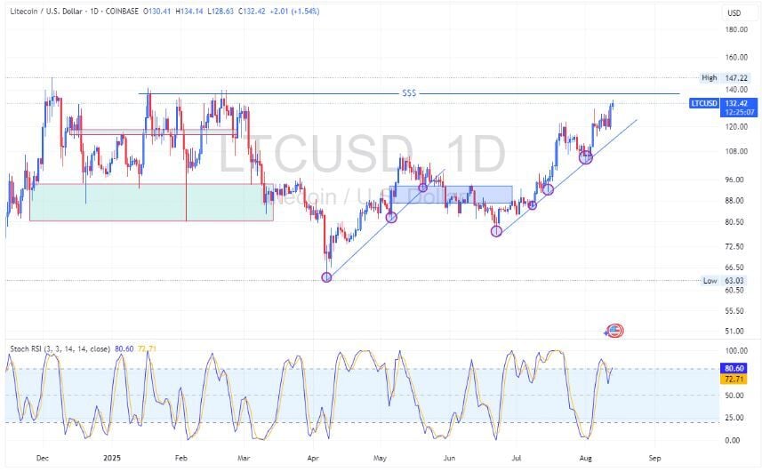 Litecoin (LTC) ha logrado superar los 132 dólares, extendiendo una tendencia alcista constante que ha mantenido durante semanas y apuntando hacia la zona de liquidez en los 137 dólares según Kelvin Murithi en Ambcrypto.