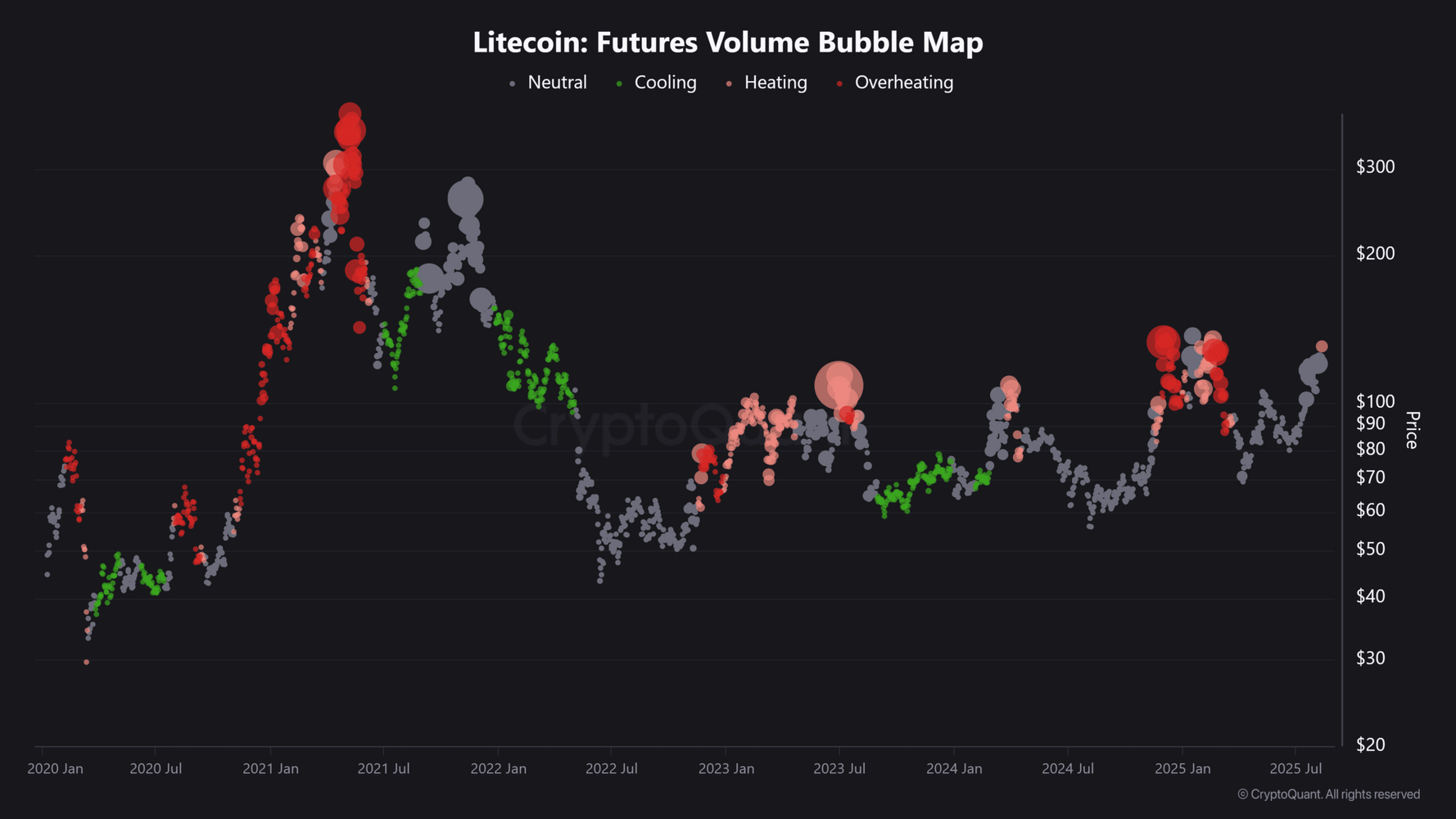 Los principales actores del mercado de Litecoin no cederán pronto. El análisis de AMBCrypto del Mapa de Burbujas de Volumen de Futuros de CryptoQuant mostró un calentamiento del mercado.