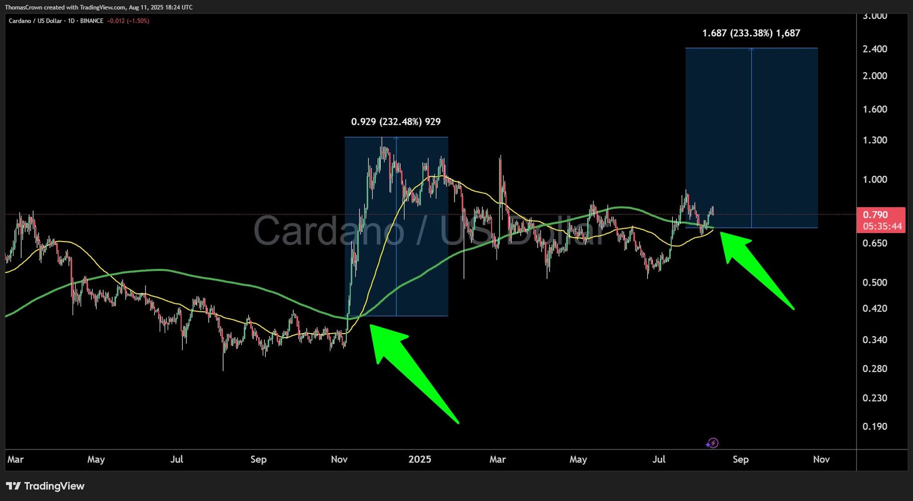 Además, Tom Crown predijo en X un posible repunte del 232% hasta los 1.68 dólares si se completa el cruce dorado.