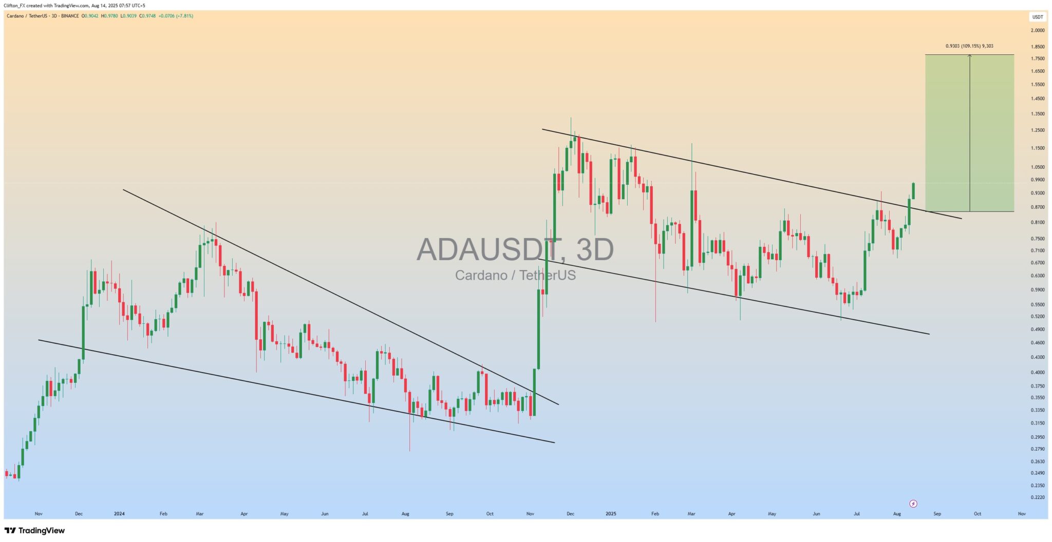 Según el analista Clifton Fx, el comportamiento reciente de ADA confirma la ruptura alcista de un patrón de bandera de toro de varios meses en el gráfico de tres días. El movimiento comenzó con un avance constante desde la línea de tendencia inferior, hasta superar una resistencia clave. Este tipo de rupturas, en términos técnicos, suelen anticipar una continuación significativa al alza.