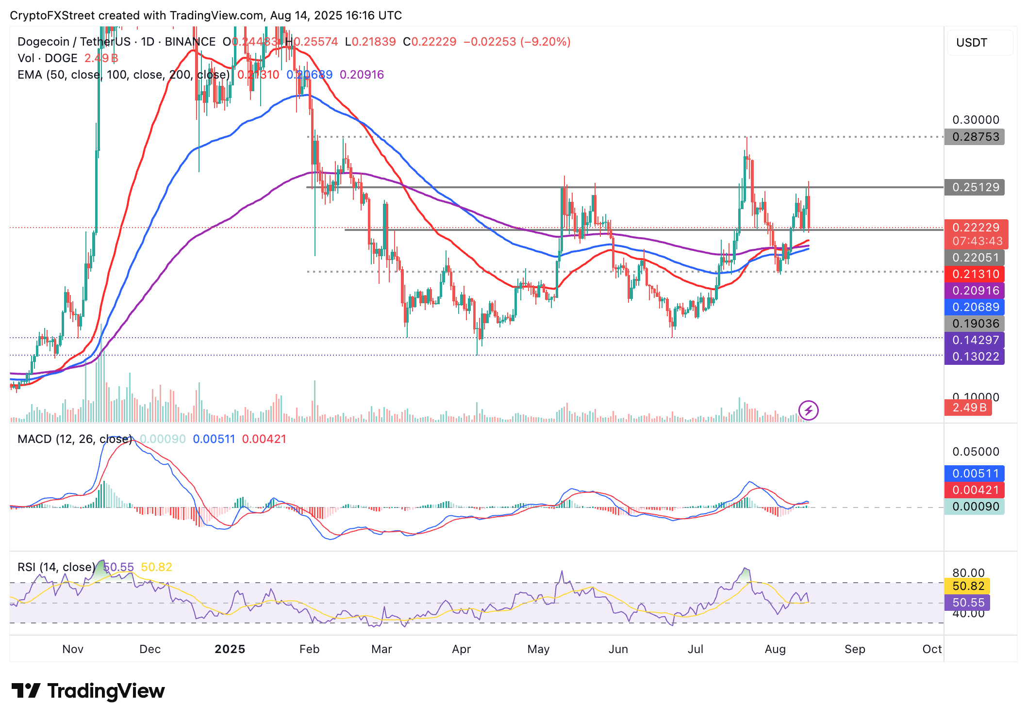 Dogecoin se mantiene por encima de medias móviles clave, incluyendo la EMA de 50 días en 0.2131$, la EMA de 200 días en 0.2091$ y la EMA de 100 días en 0.2069$. Estos niveles servirán como soporte tentativo si la caída se extiende por debajo del soporte a corto plazo en 0.2200$, puesto a prueba el 25 de julio.