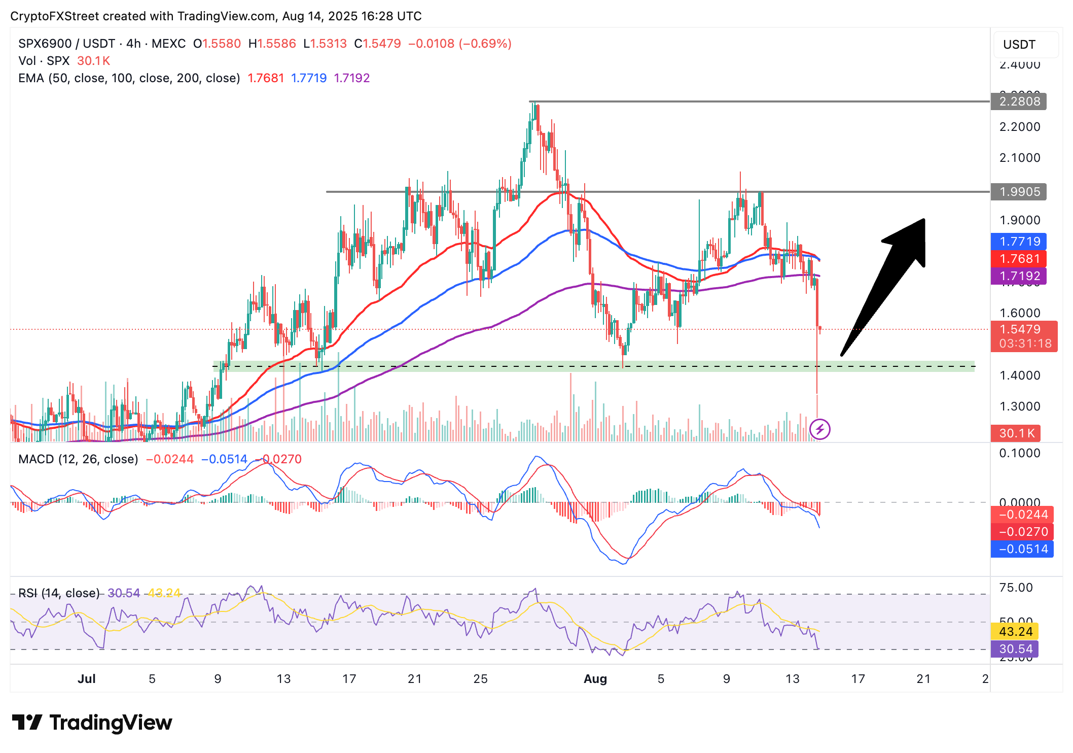 Aún así, podría producirse una recuperación desde 1.55$, el nivel actual de SPX, especialmente con el RSI entrando en territorio de sobreventa. Los objetivos clave al alza oscilan entre la EMA de 200 períodos en 1.71$, la congestión de vendedores en 2.00$ y el pico de julio de SPX de 2.28$.