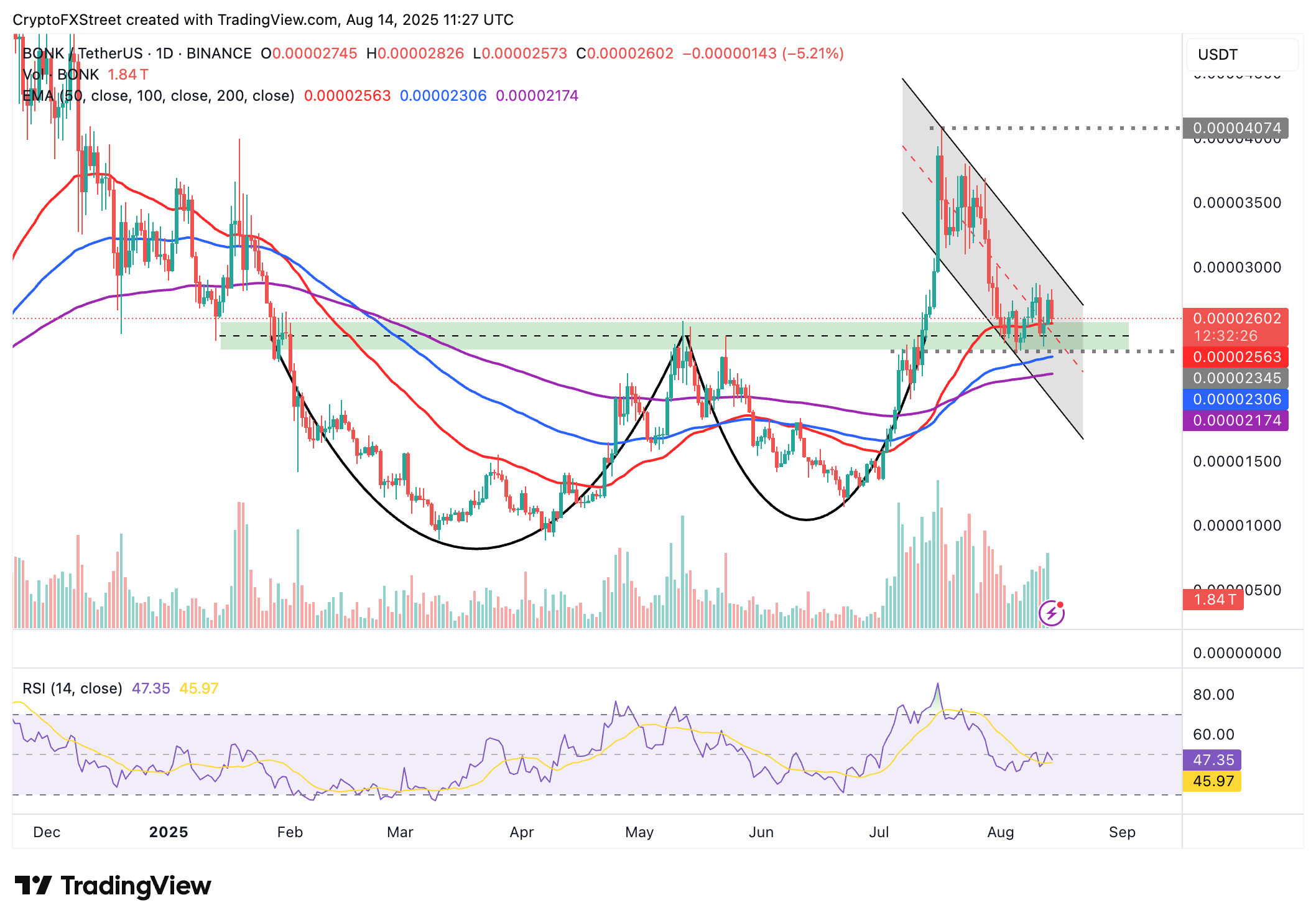 La EMA de 100 días en 0.000023$ está en línea para absorber la presión de venta si la caída se acelera por debajo de la línea de cuello.
