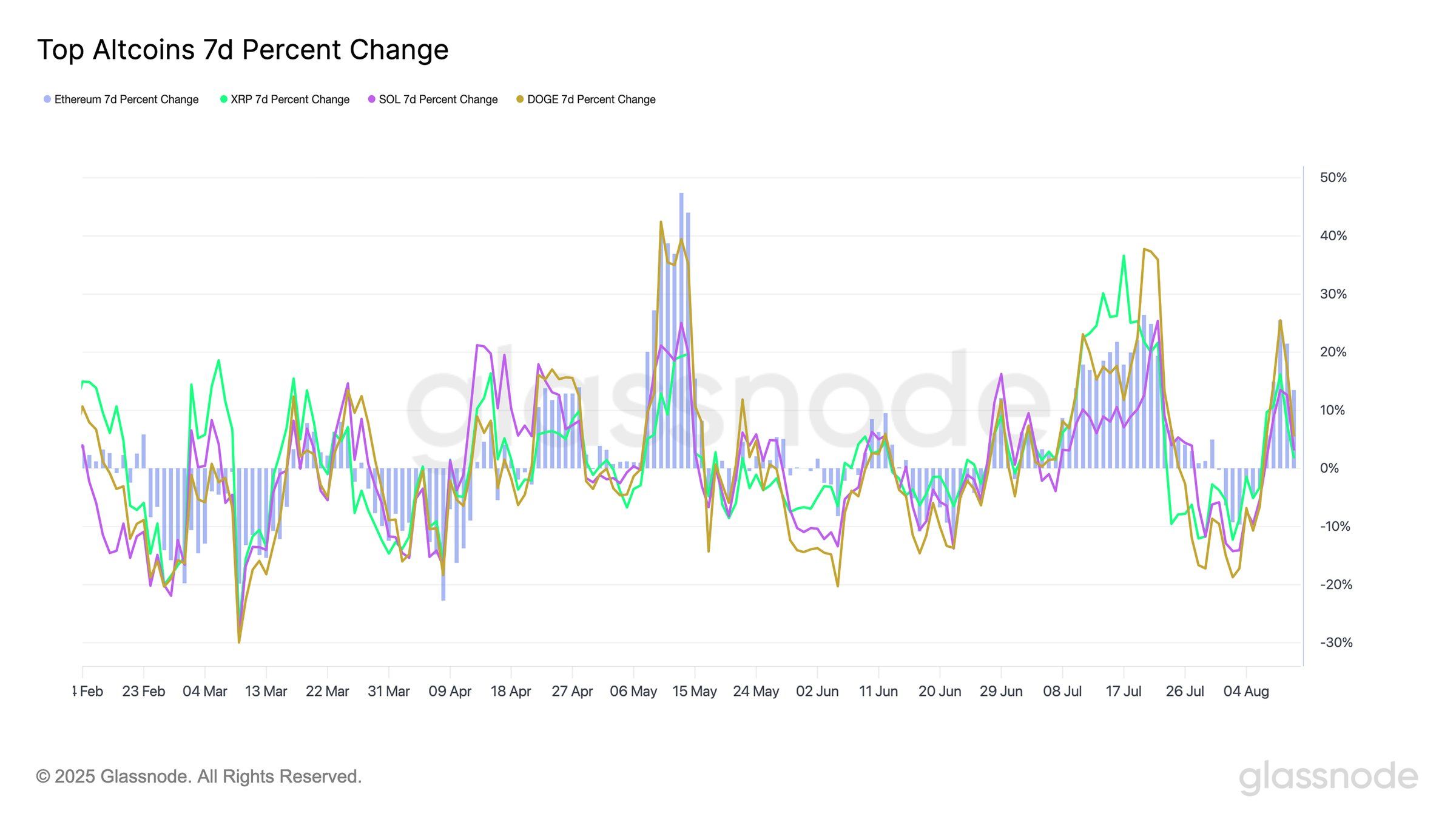“Los retornos de 7 días destacan la fortaleza general de las altcoins: ETH +25.5%, DOGE +25.5%, XRP +16.2%, SOL +13.6%. Estos movimientos reflejan una intensificación de la oferta especulativa y un apetito generalizado del mercado por exposiciones de mayor beta a medida que el momentum se construye fuera de $BTC,” informó Glassnode.