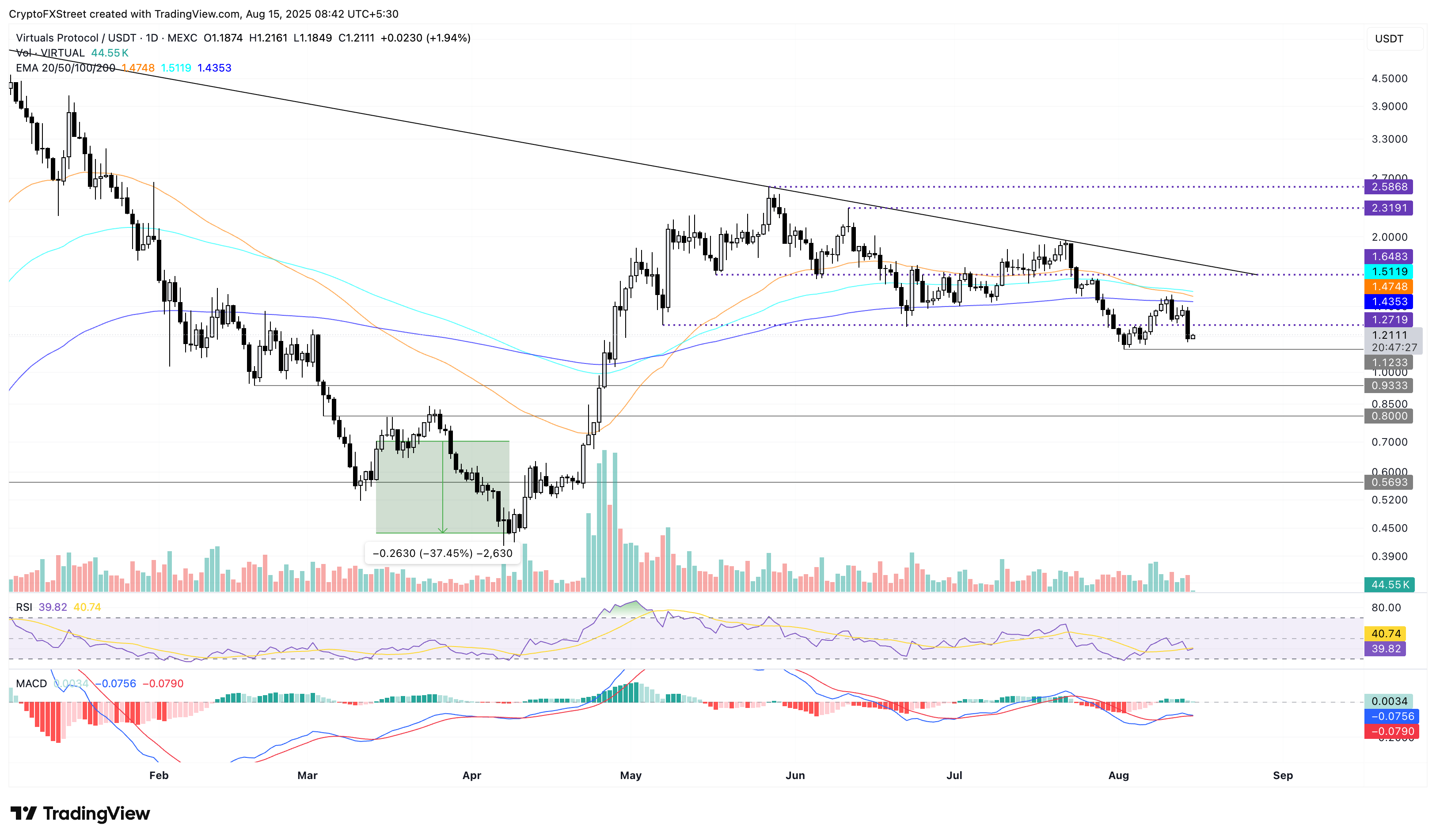 Virtuals Protocol se mantiene por debajo de la EMA de 200 días tras caer más del 13% el jueves. VIRTUAL se recupera un 2% en el momento de escribir el viernes, ya que la EMA de 50 y 200 días en declive arriesga un cruce mortal, emitiendo una señal de venta que llevó a un colapso cercano al 40% la última vez en marzo.