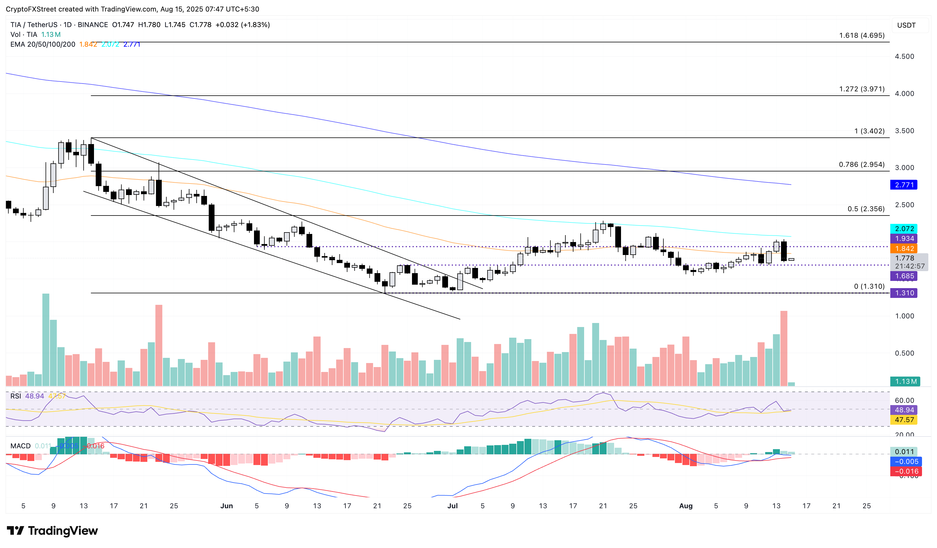 Celestia se apreció casi un 2% en el momento de la publicación el viernes, tras la caída cercana al 13% del día anterior, que formó una vela envolvente bajista. A pesar de la venta masiva, TIA mantiene su posición por encima del nivel de soporte de 1.685$ marcado por el máximo del 24 de junio.