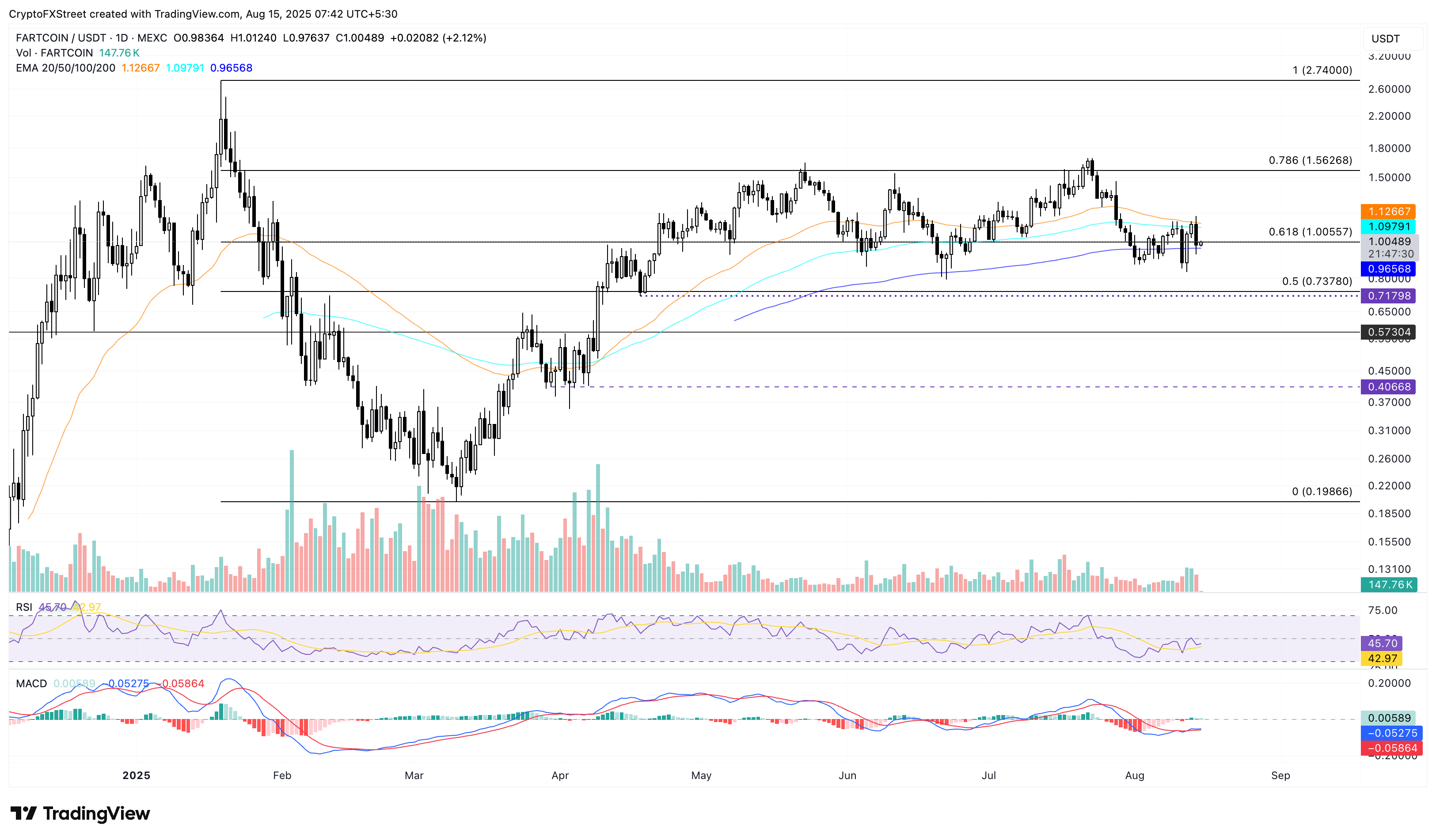 Fartcoin sube un 2% en el momento de la publicación el viernes tras una pérdida del 12.36% el día anterior. La moneda meme basada en Solana se mantiene por encima de la media móvil exponencial (EMA) de 200 días en 0.9656$, luchando por superar el nivel de Fibonacci del 61.8% en 1.0055$, que se traza desde el pico de 2.7400$ del 19 de enero hasta el 0.1986$ del 10 de marzo.