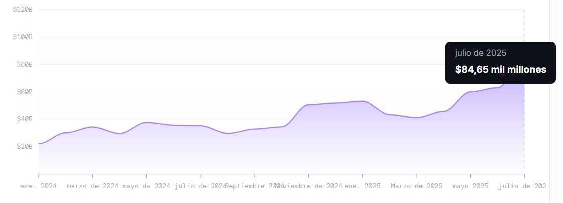 Con una cuota de mercado del 84% en el segmento de oráculos en Ethereum y una participación del 68% en todo el ecosistema DeFi, Chainlink asegura, hasta julio, 84.650 millones de dólares en valor total protegido. Esta posición lo convierte en un proveedor clave para un mercado que se proyecta hacia billones de dólares en activos tokenizados, argumenta el especialista.