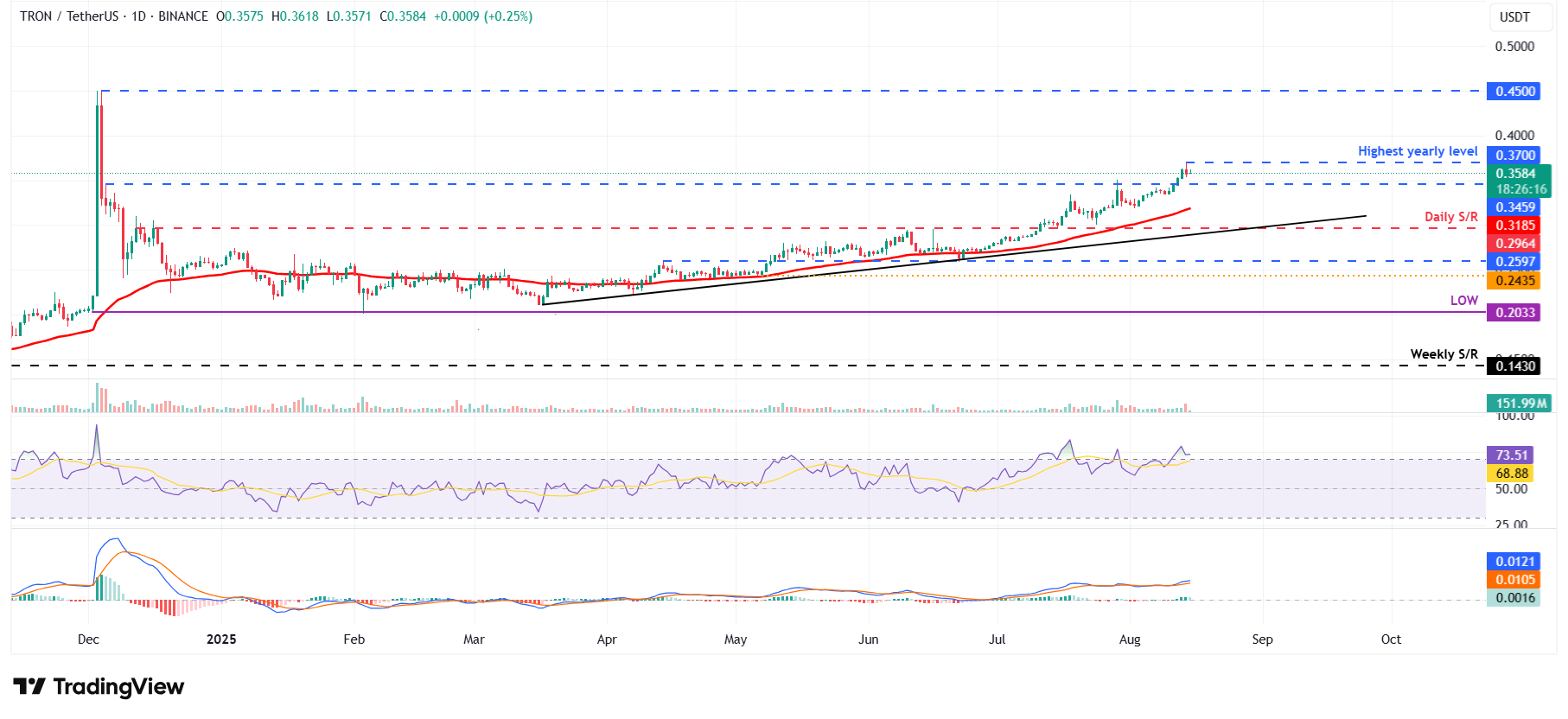 El precio de Tron alcanzó un nuevo máximo anual de 0.37$ el jueves tras un rally de casi el 35% desde mediados de junio. Al momento de escribir el viernes, se negocia alrededor de 0.35$.