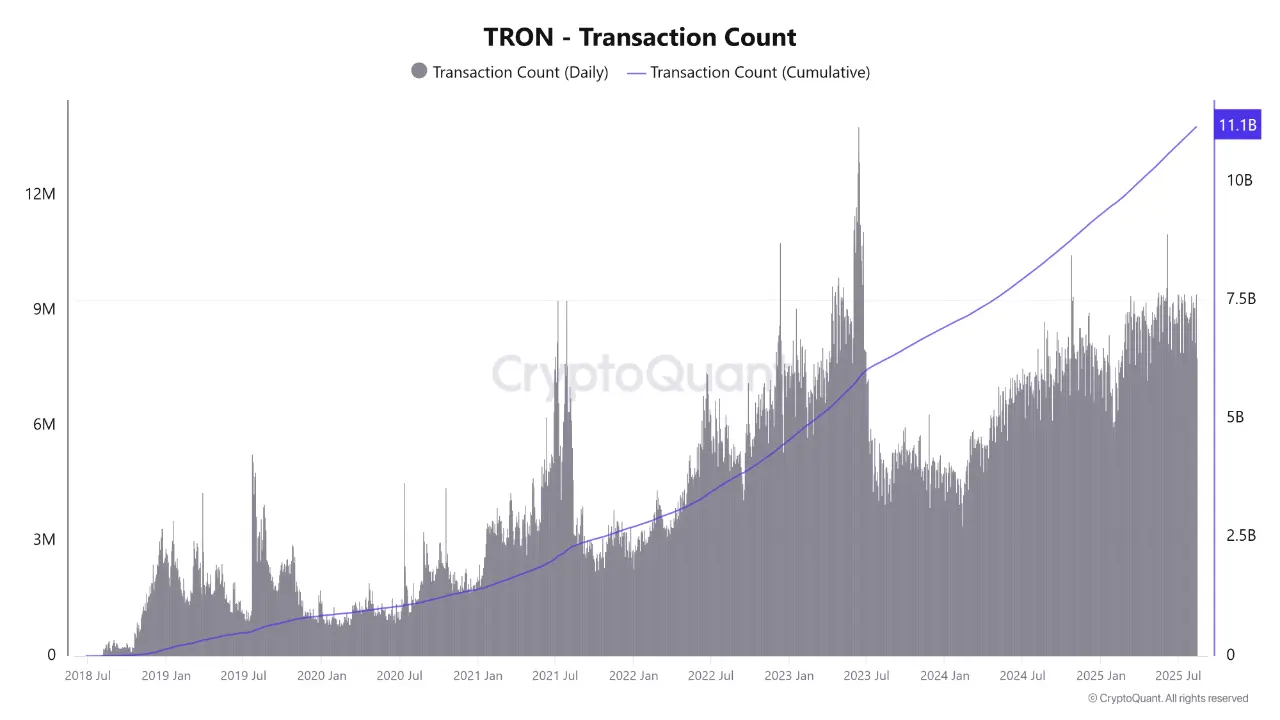 Los datos de CryptoQuant muestran que el conteo de transacciones de Tron ha superado los 11.1 mil millones, destacando una red en crecimiento. La comparación histórica muestra que la tasa diaria actual es de aproximadamente 7–9 millones de transacciones por día, con picos que se acercan a 10 millones; esto es significativamente más alto que los niveles vistos a principios de 2024, sugiriendo un fuerte crecimiento en comparación con el ciclo anterior.
