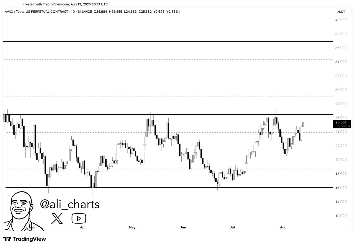 - Martinez observa que AVAX podría llegar a $32-$37 si supera los $27.