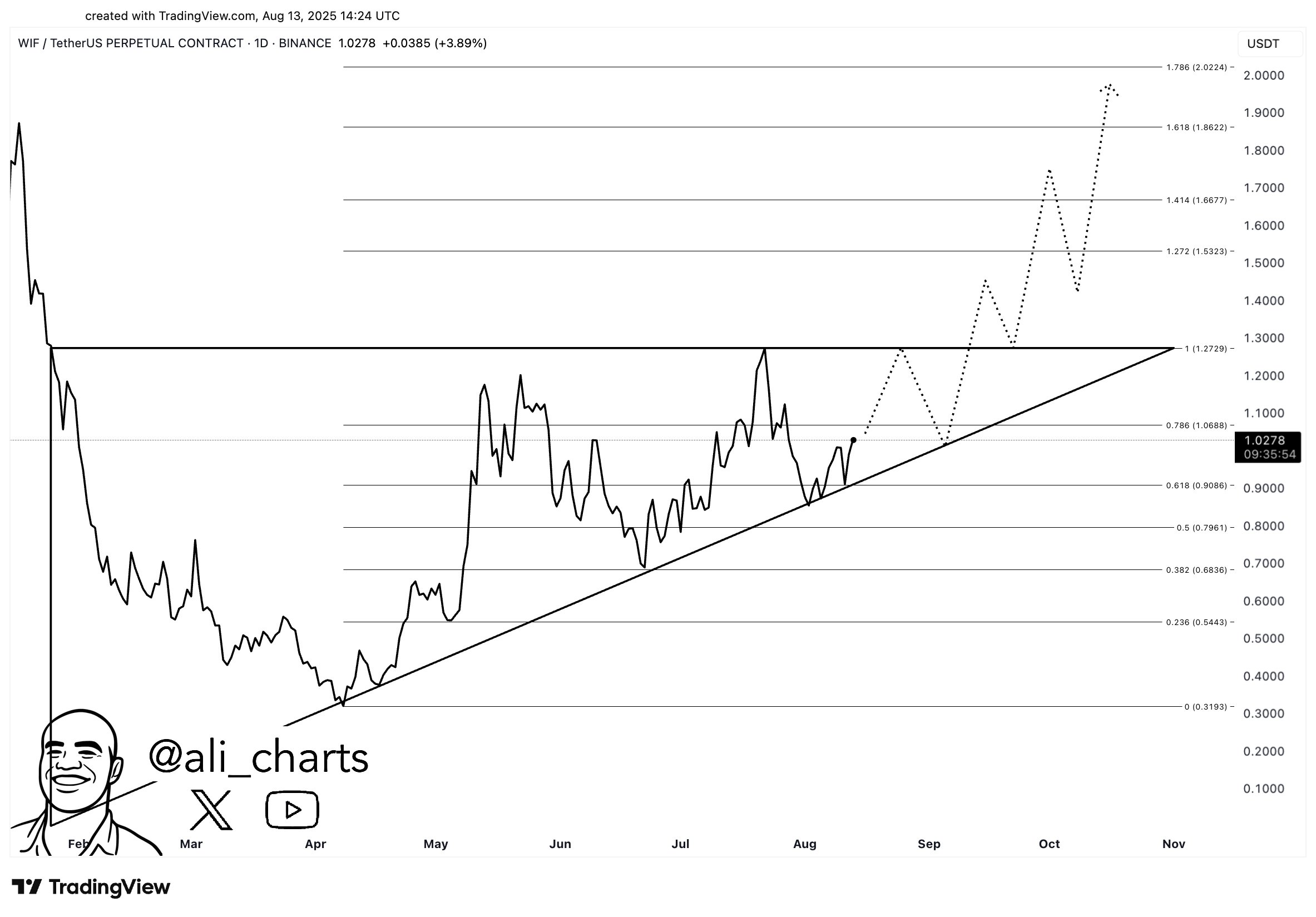 Martinez observó que WIF está consolidándose dentro de una formación triangular. Una ruptura hacia arriba podría enfocar la atención en la marca de $2. El gráfico compartido muestra los límites de esta formación e indica el rango objetivo potencial para una salida alcista.