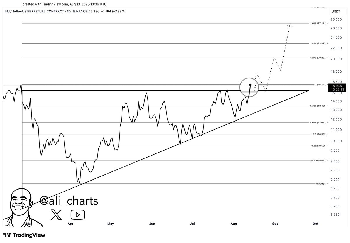 La ambiciosa meta de $75 sugiere una oportunidad atractiva de beneficio para aquellos que compren a precios actuales. El gráfico de INJ Coin compartido por Ali Martinez destaca el potencial para una corrección antes de un aumento más fuerte, con un objetivo de $28, indicando un incremento cercano al 100%.