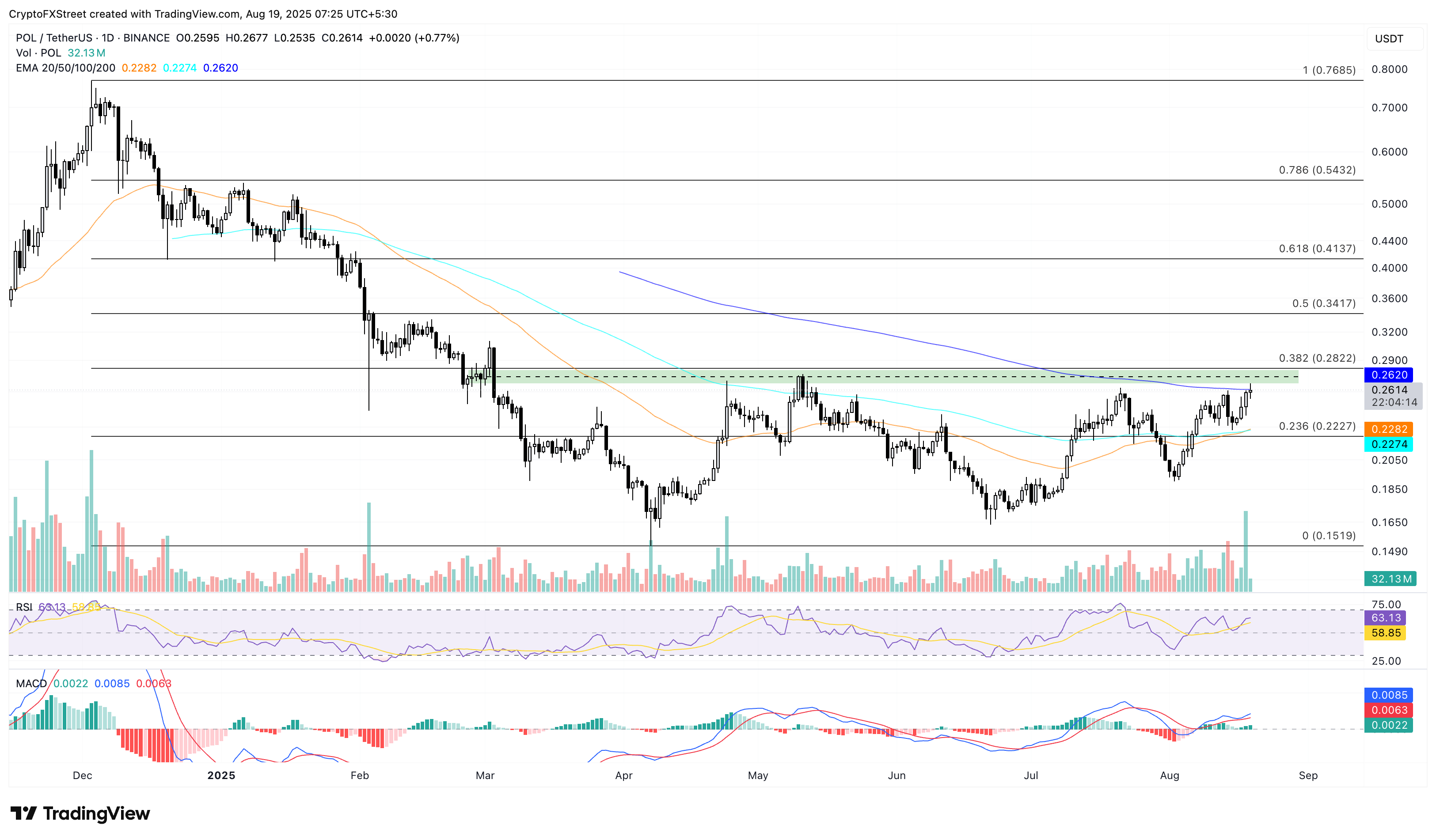 POL avanza casi un 1% en el momento de la publicación el martes, desafiando la EMA de 200 días en 0.2620$. La recuperación a corto plazo se extiende por cuarto día consecutivo, acercándose a la zona de oferta de 0.2800$ y al nivel de Fibonacci del 38.2% en 0.2822$, que se dibuja desde el máximo de 0.7685$ el 3 de diciembre hasta el mínimo de 0.1519$ el 7 de abril.