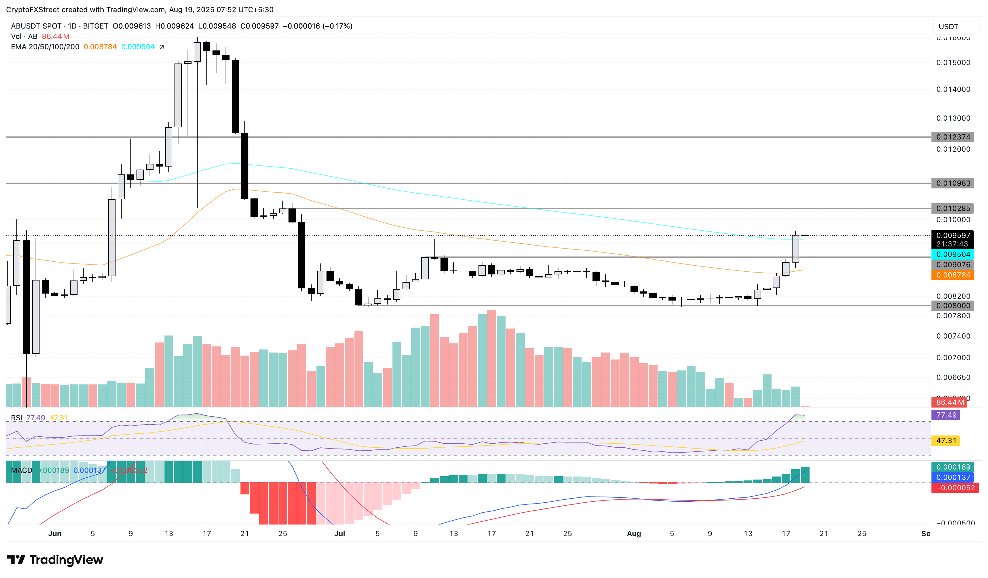 AB se desliza a la baja en el momento de la publicación el martes, después de imprimir cinco velas alcistas consecutivas. La tendencia alcista marca la ruptura de una fase de consolidación y la media móvil exponencial (EMA) de 100 días en 0.009504$.