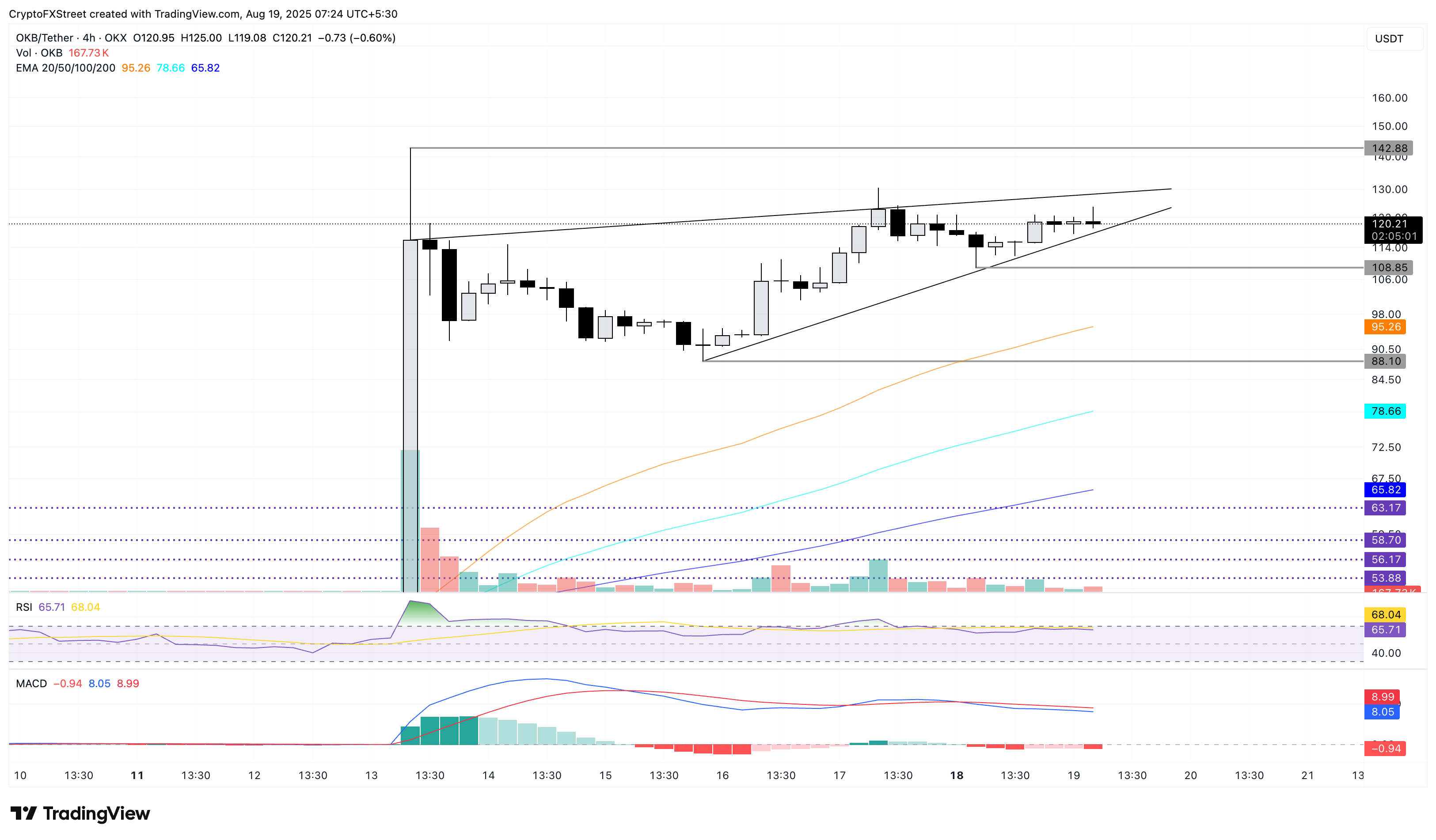 OKB mantiene una tendencia alcista en movimiento tras el aumento de tres dígitos del miércoles anterior. Sin embargo, la acción del precio forma un patrón de cuña ascendente en el gráfico de 4 horas (compartido a continuación), subrayando el riesgo de un posible retroceso.
