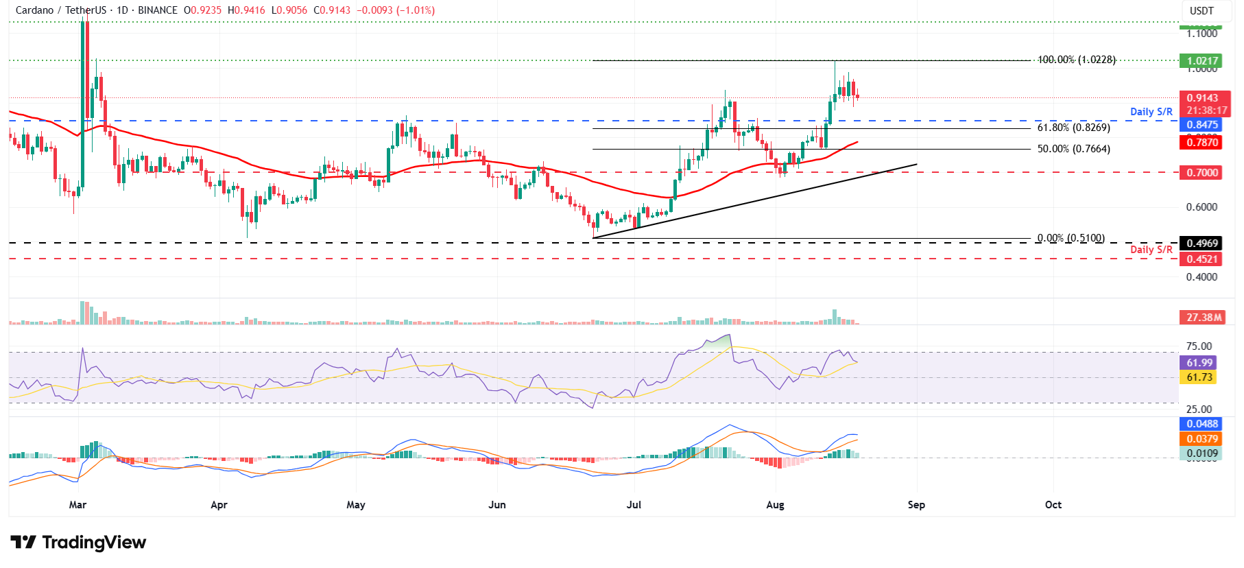El precio de Cardano superó su nivel psicológico de 1$ el 14 de agosto, repuntando casi un 20% la semana pasada. Al inicio de esta semana, el lunes, cayó un 3.88%. Al momento de escribir el martes, continúa cotizando a la baja alrededor de 0.91$.