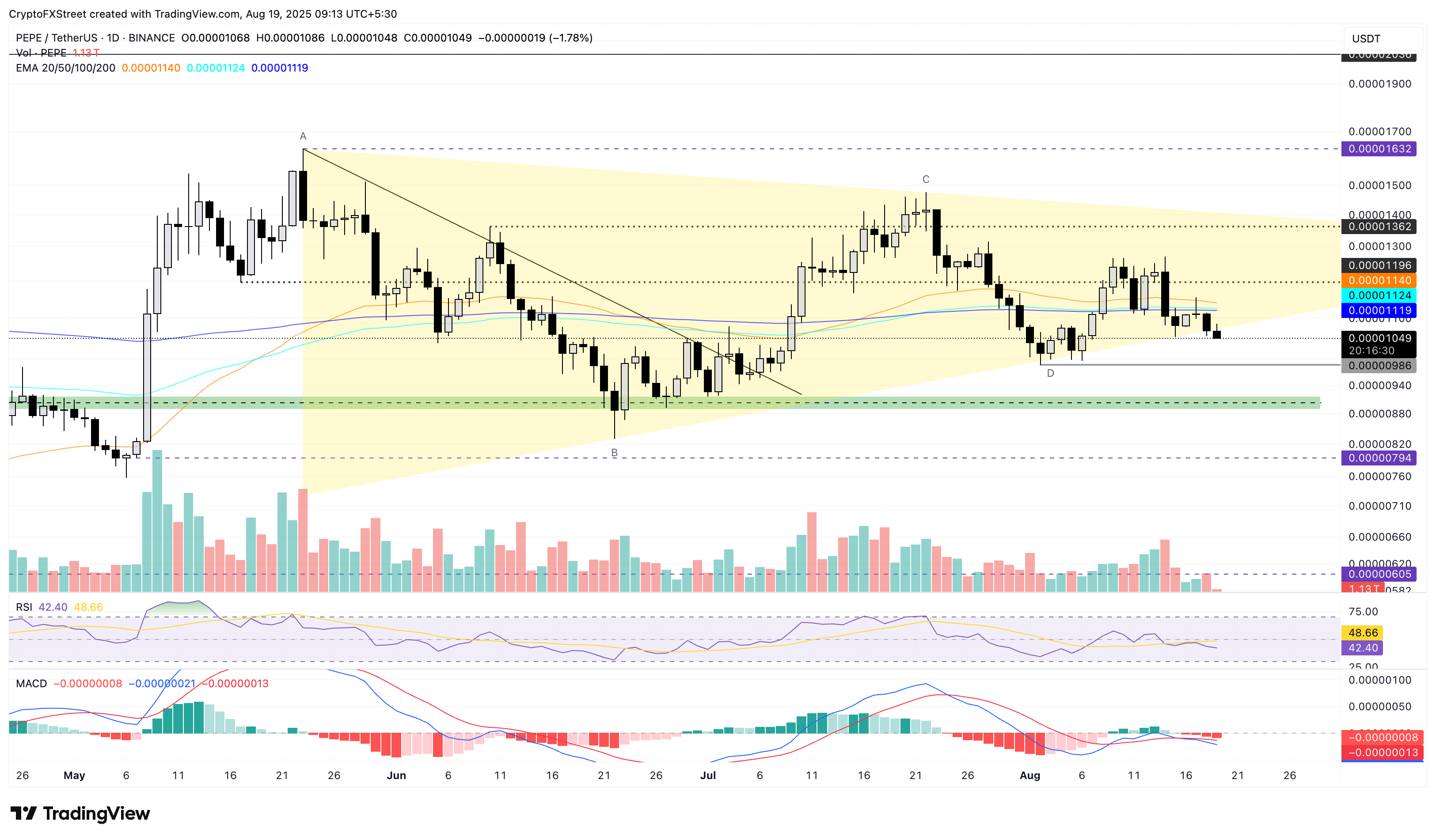 Al igual que SHIB, Pepe corre el riesgo de una ruptura del triángulo simétrico en el gráfico diario (compartido a continuación). La moneda meme con temática de rana baja más del 1% al momento de la publicación el martes, extendiendo la caída del 3.96% del día anterior.