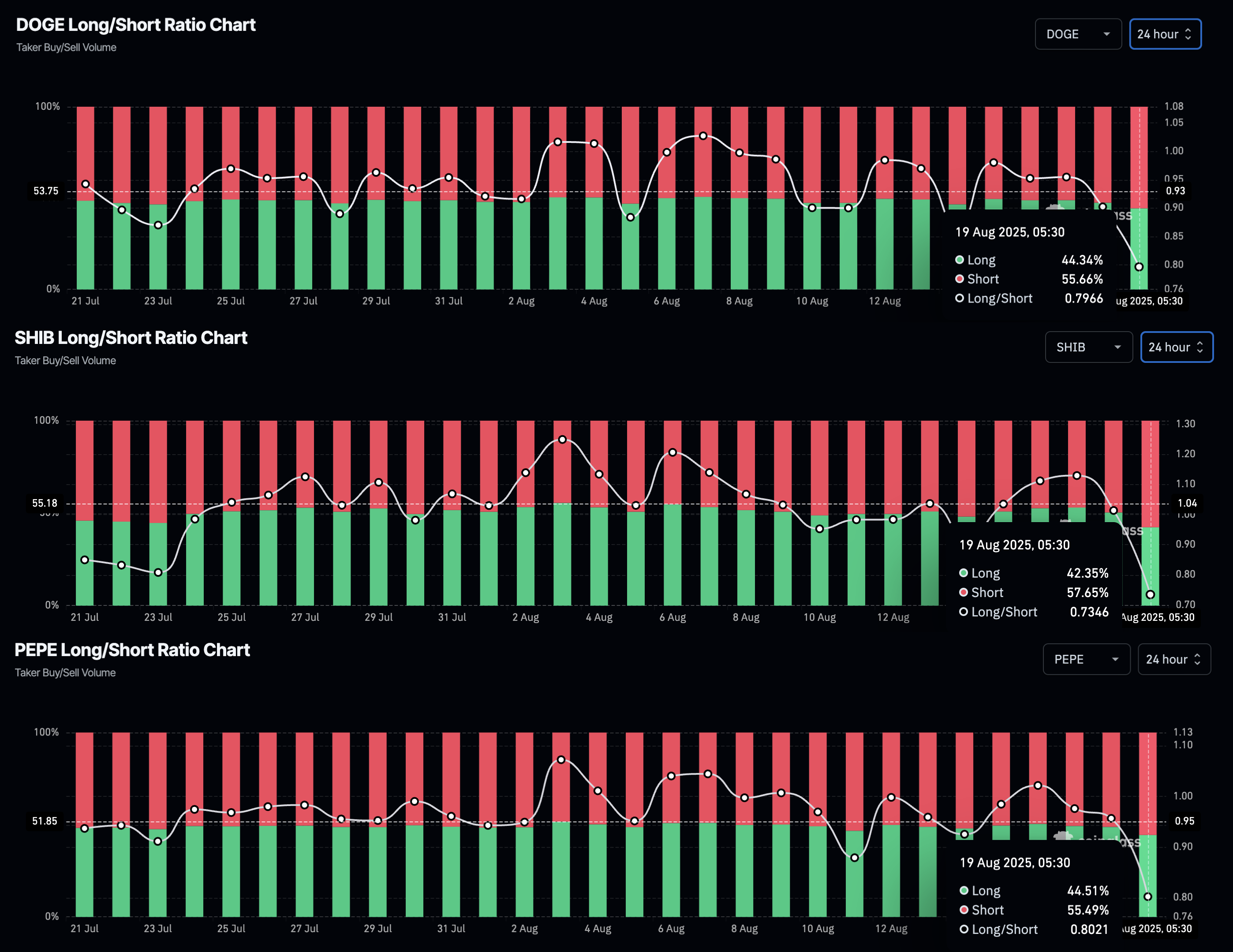 Los datos de CoinGlass muestran que las posiciones cortas están en aumento, sugiriendo un dominio del lado de venta en el mercado de derivados de DOGE, SHIB y PEPE. Esto sugiere un sentimiento de aversión al riesgo en expansión, ya que la mayoría de los traders anticipan más pérdidas.