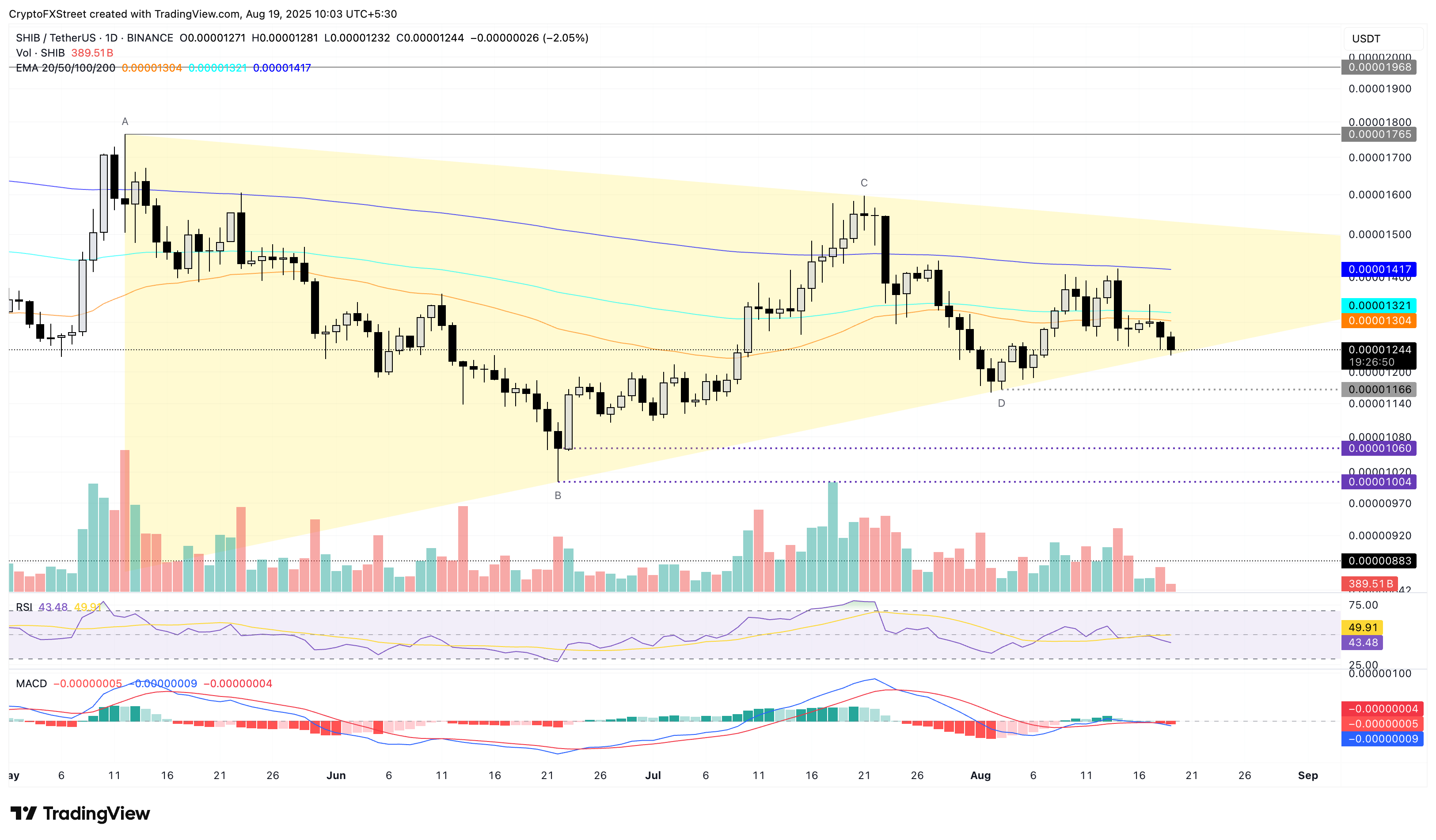 Shiba Inu no logró mantenerse por encima de la EMA de 50 días el domingo, resultando en una caída del 2.46% el lunes. Al momento de escribir, SHIB baja un 2% el martes, arriesgando una ruptura de un patrón de triángulo simétrico en el gráfico diario (compartido a continuación).