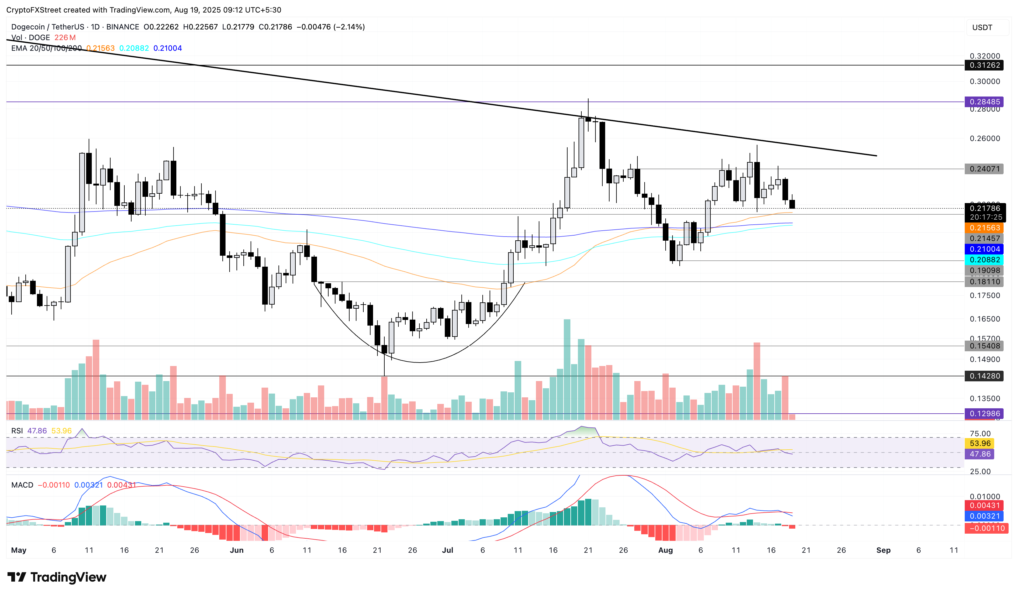 Dogecoin baja un 2% al momento de la publicación el martes, extendiendo la pérdida del 5% del lunes y acercándose a la Media Móvil Exponencial de 50 días en 0.2163$. Un empuje decisivo por debajo de la EMA de 50 días podría extender el declive hasta la EMA de 200 días en 0.2100$.