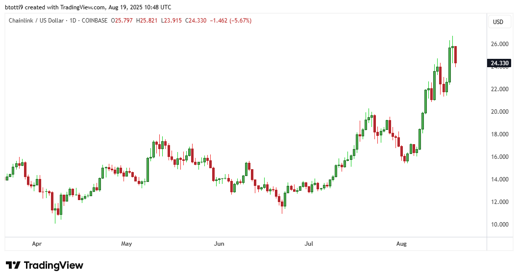 - El precio de Chainlink rompió a máximos de 26 dólares antes de corregirse ligeramente.