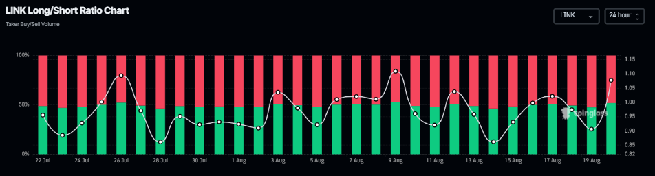 Los datos de la relación larga-corta de Chainlink en Coinglass indican que la apuesta alcista entre los operadores también está aumentando, acercándose a su máximo mensual, lo que refleja un sentimiento alcista en los mercados.