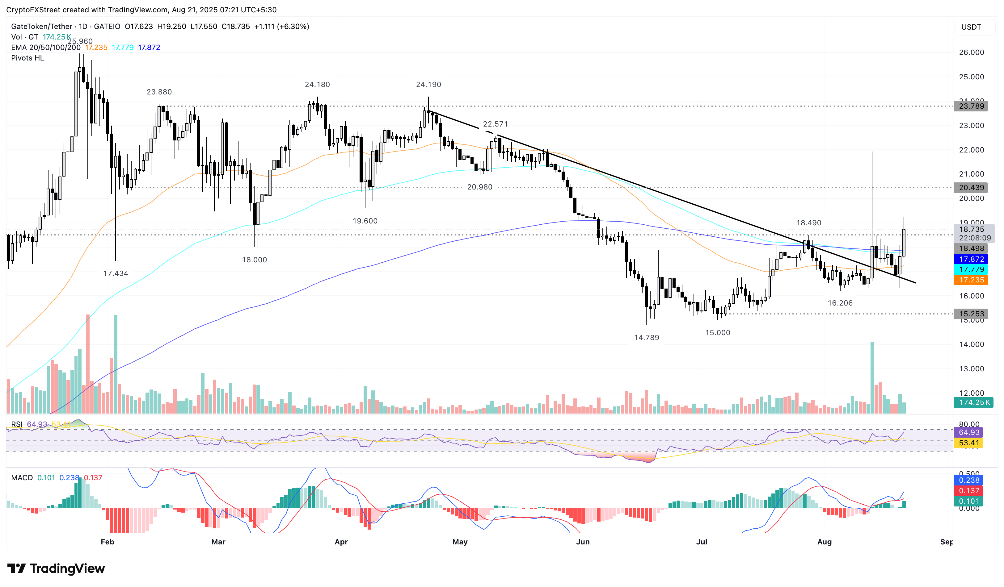 GateToken añade más del 6% de ganancias en el momento de escribir el jueves, extendiendo el aumento del 4.49% del día anterior. El rebote desde una línea de tendencia rota en un gráfico diario (compartido a continuación) supera el nivel de resistencia de 18.49$, probado por última vez el 14 de agosto.