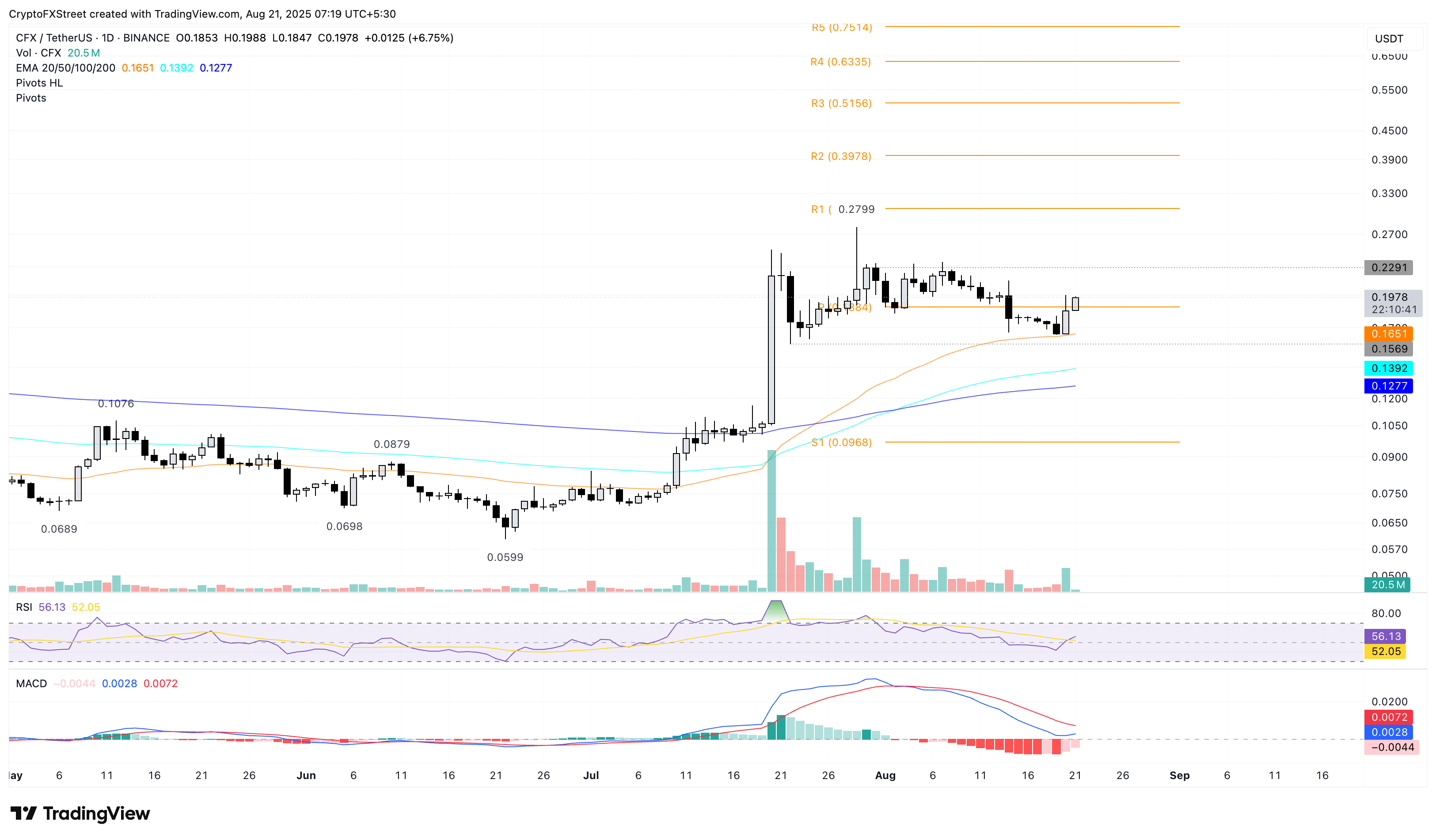 Conflux registra un aumento de más del 6% hasta ahora el jueves, sumando un rebote del 12% desde la EMA de 50 días el miércoles. La altcoin fluctúa cerca del nivel de pivote central en 0.1884$.