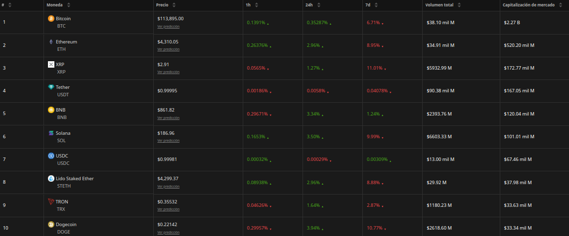 En primer lugar, Bitcoin (BTC) se mantiene estable alrededor de los 113,800 dólares, tras retroceder desde los máximos de 124,000 dólares alcanzados la semana pasada.