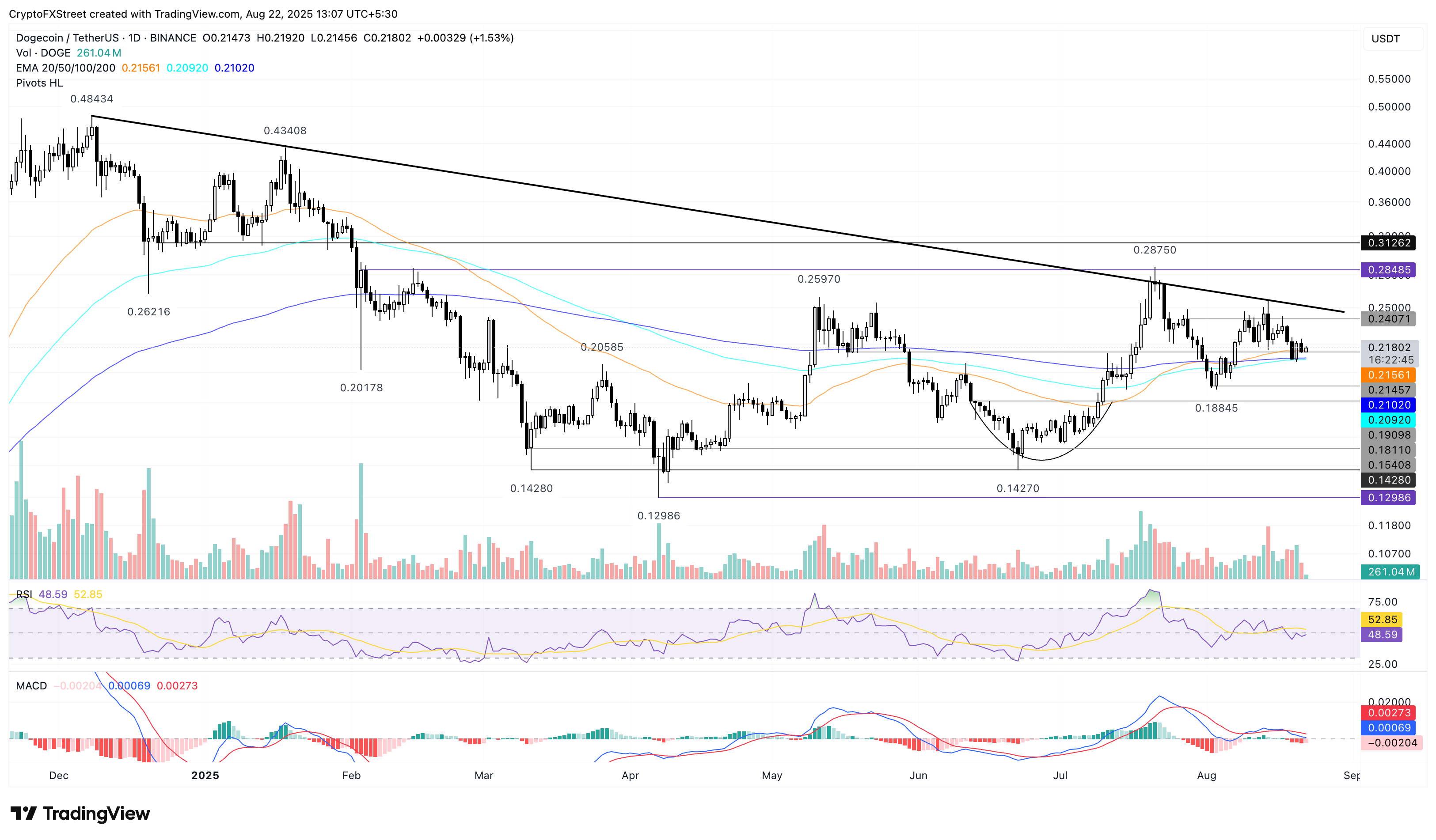 Una caída por debajo de la EMA de 100 días en 0.2092$ podría enviar a DOGE al mínimo de 0.1884$ del 3 de agosto.