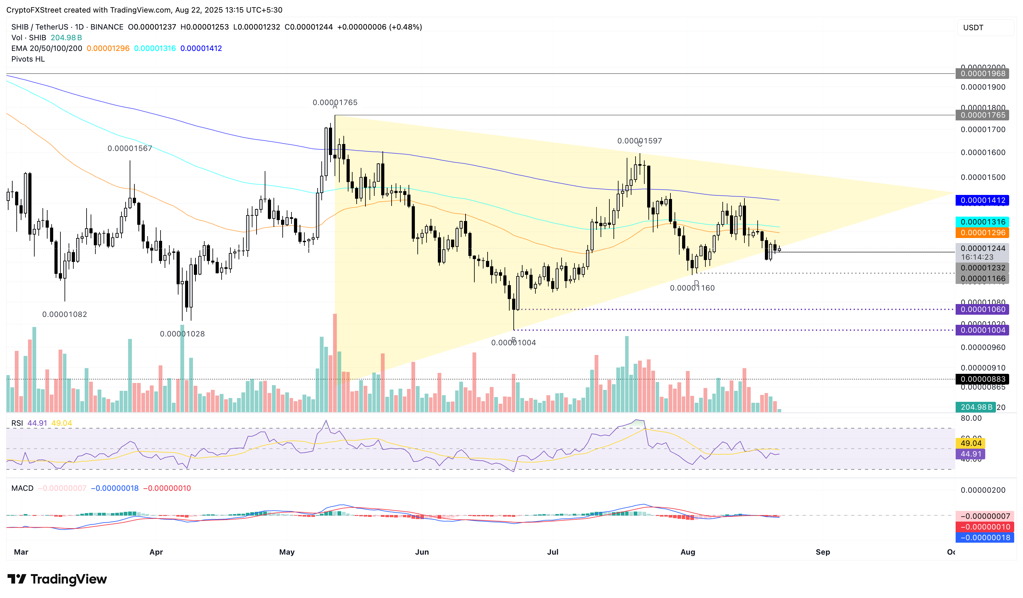 Shiba Inu se mantiene por encima de 0.00001244$ en el momento de la redacción el viernes, tras la caída del 1.59% del jueves. La moneda meme arriesga más pérdidas hasta el mínimo de 0.00001160$ del 2 de agosto si se rompen los niveles de soporte.