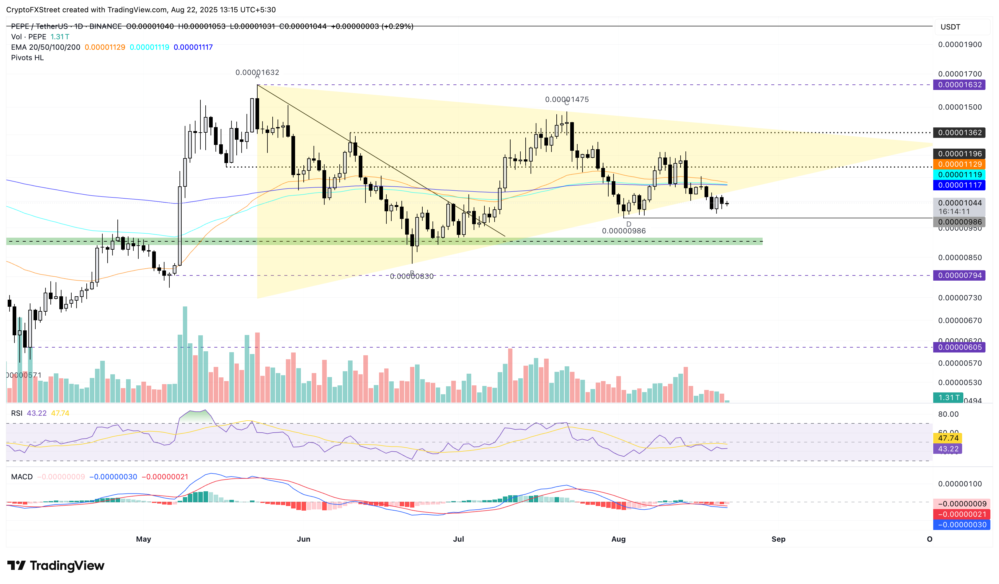 Pepe extiende la tendencia a la baja tras la ruptura de un triángulo simétrico en el gráfico diario. En el momento de la redacción, la moneda meme con temática de rana cotiza a 0.00001044$, manteniéndose por encima del nivel psicológico de 0.00001000$.