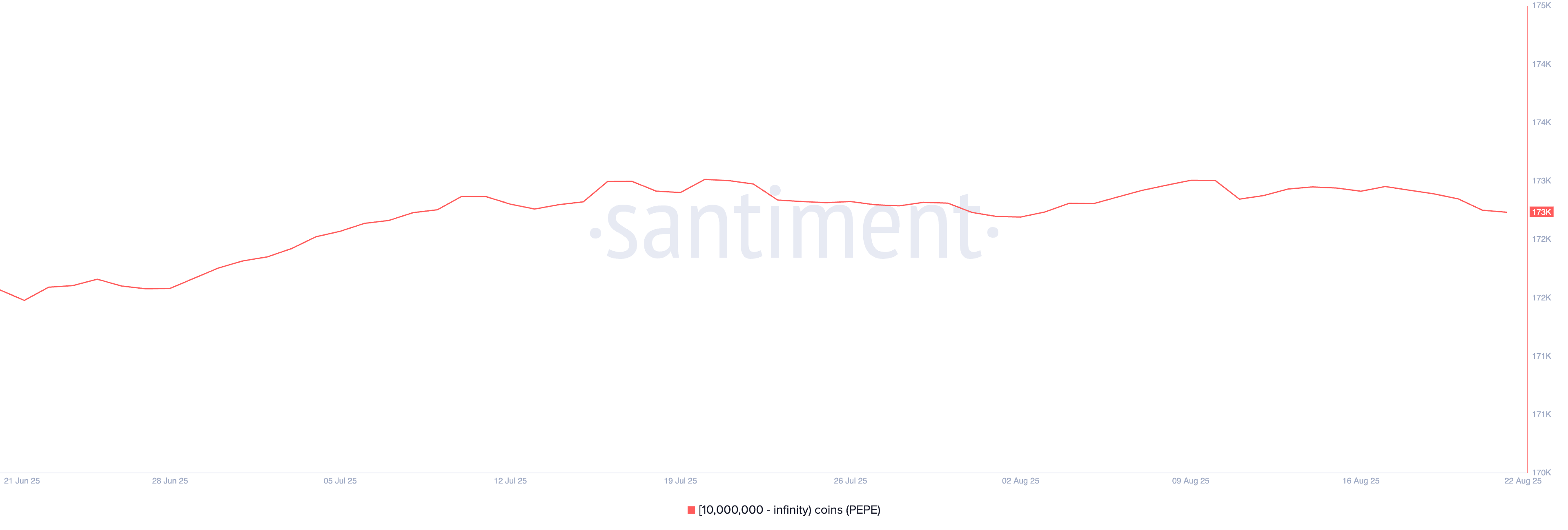 De manera similar, el conteo de ballenas de PEPE es de 173K, bajando desde el máximo de 30 días de 173.57K.