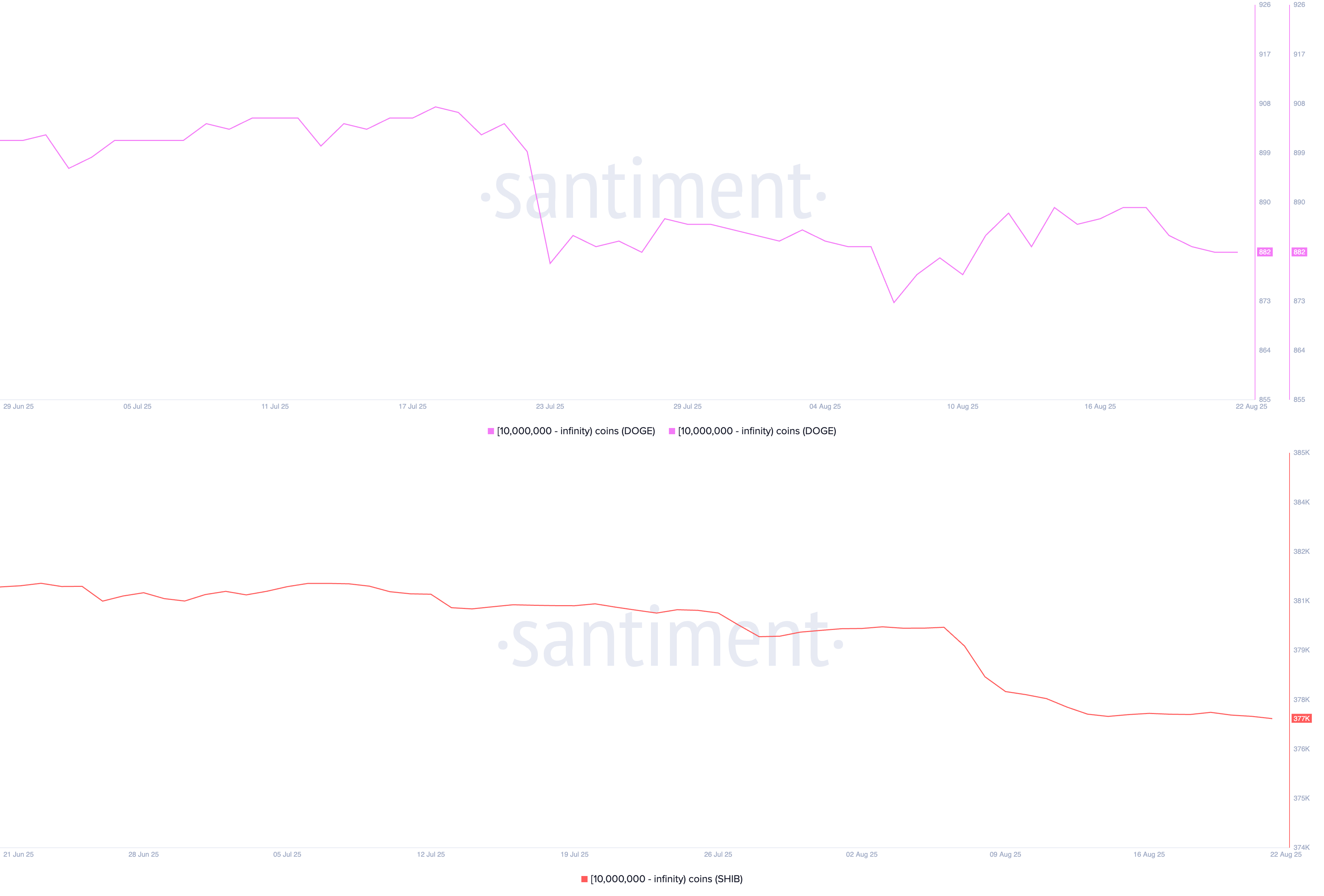 Los datos de Santiment muestran una disminución en las ballenas de DOGE, con inversores que poseen más de 10 millones de tokens cayendo a 882 desde 887 el lunes. La disminución en las ballenas de SHIB alcanza 377K, bajando desde el máximo mensual de 380.48K.