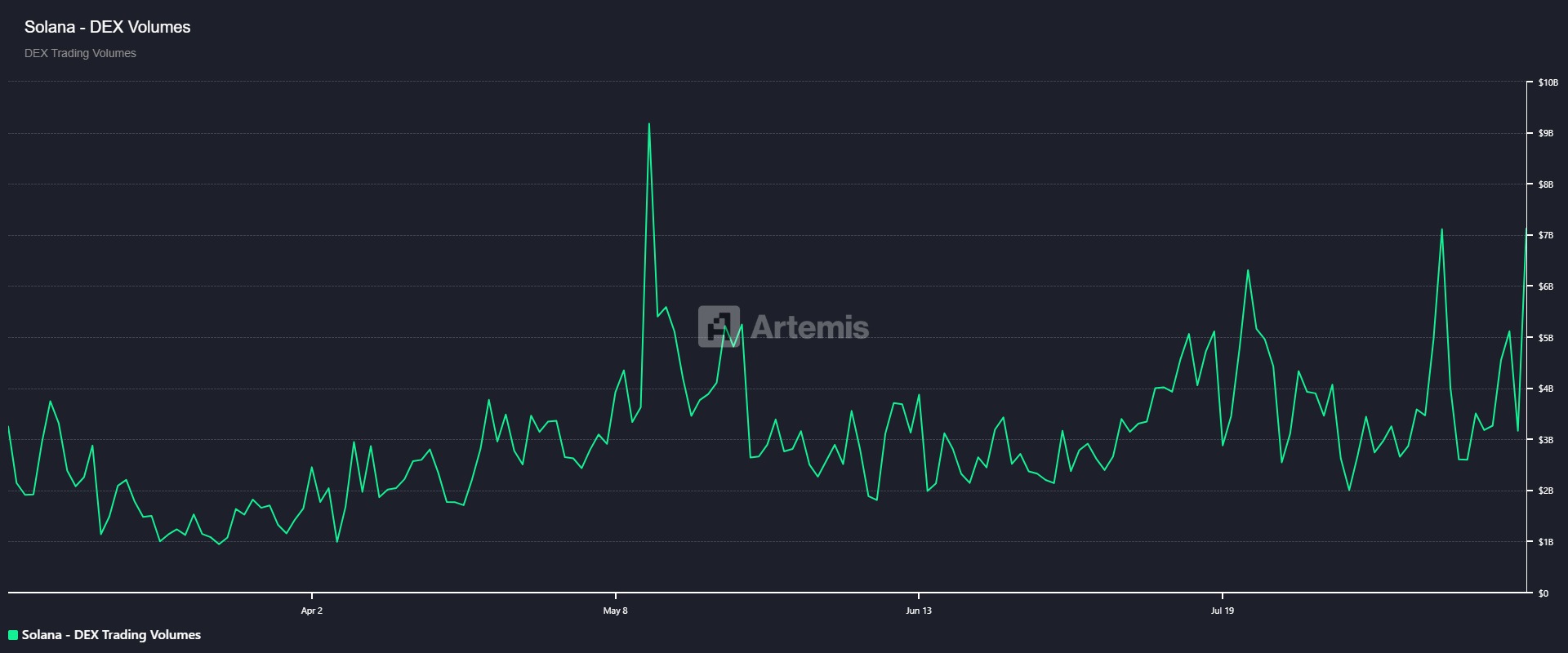 Otro aspecto que refuerza la perspectiva alcista de la plataforma es un reciente aumento en el interés de los traders y la liquidez en la cadena de Solana. Los datos de Artemis Terminal muestran que el volumen de comercio en el intercambio descentralizado (DEX) de la cadena SOL aumentó de 2.6 mil millones de dólares el 17 de agosto a 7.1 mil millones de dólares el domingo.