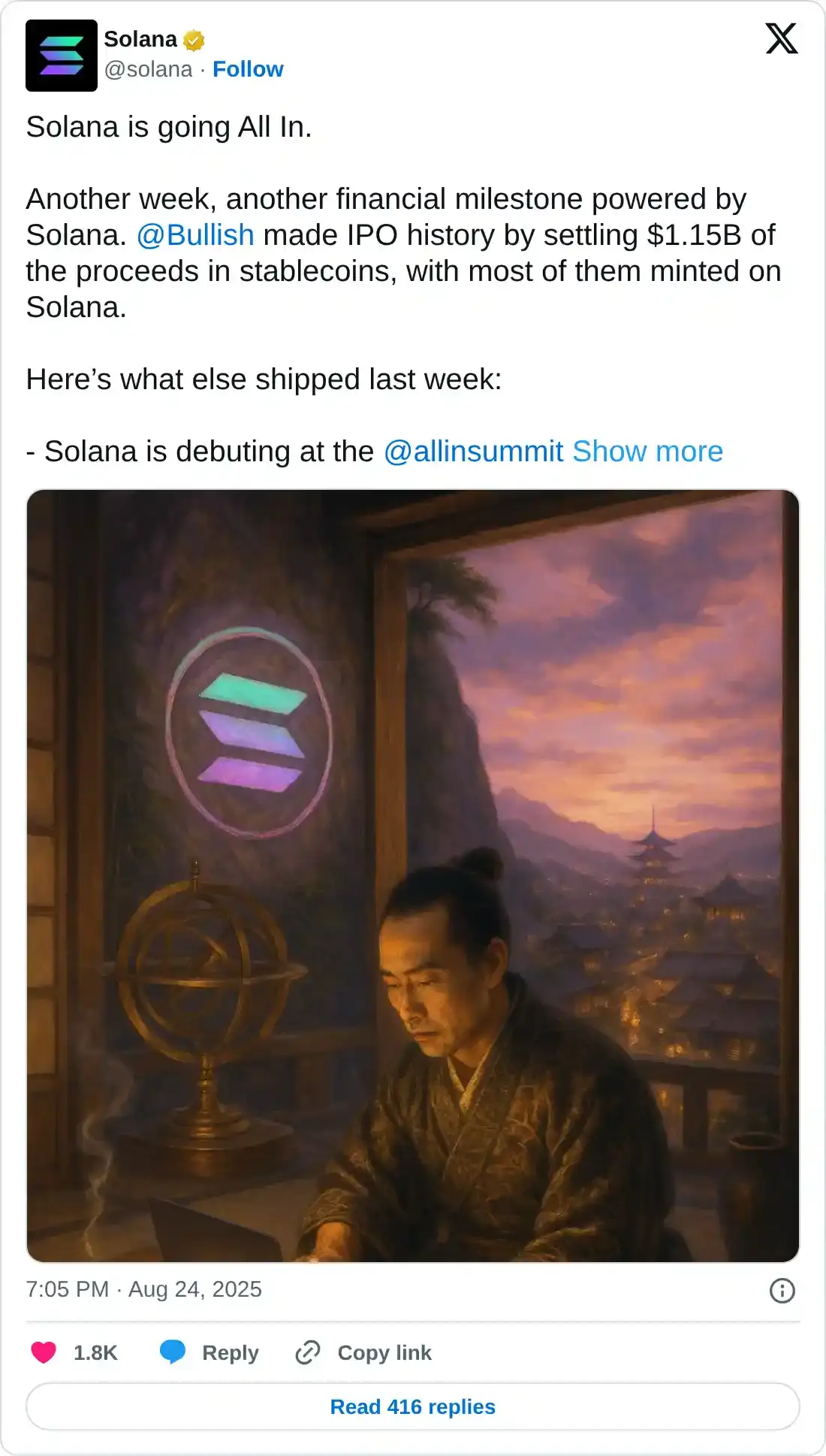 Bullish (BLSH), una plataforma global de activos digitales enfocada en instituciones que proporciona infraestructura de mercado y servicios de información, anunció que ha recibido 1.15 mil millones de dólares de ingresos de su reciente oferta pública inicial en stablecoins en EE.UU., siendo la mayoría de estas stablecoins acuñadas en la red Solana, impulsando la demanda del ecosistema.