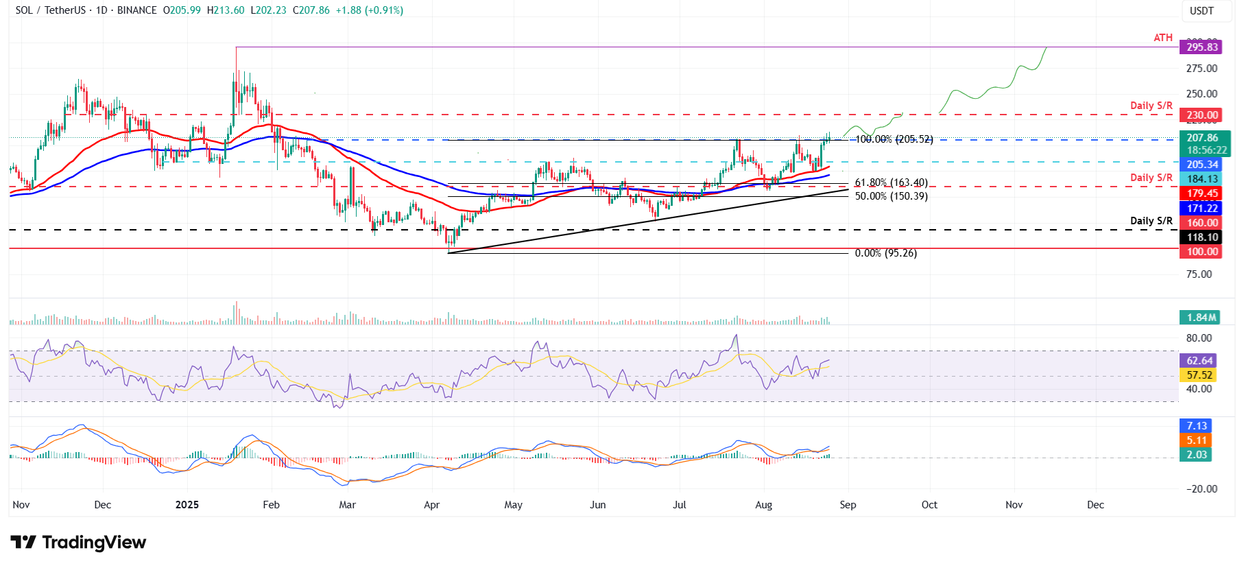 Si SOL continúa su tendencia alcista, podría extender el repunte hacia su próxima resistencia diaria en 230$. Un cierre exitoso por encima de este nivel podría extender las ganancias hacia su máximo histórico de 295.83$.