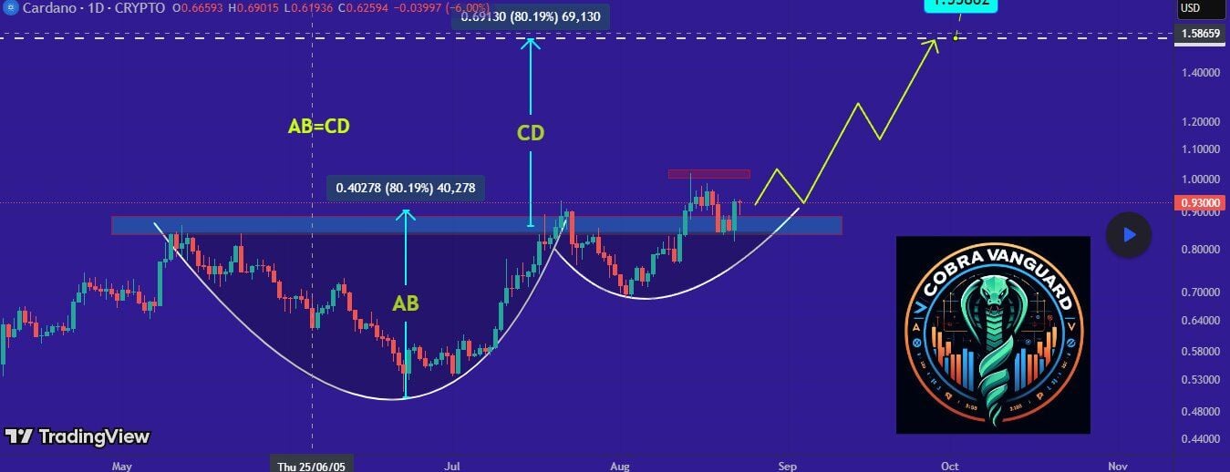 El precio de Cardano (ADA) acompaña la tendencia alcista general en el mercado con un aumento del 10% en las últimas 24hs. A esto hay que sumarle un patrón taza y asa que apunta a alcanzar el dólar, según Gary Ponce en Blocknews.